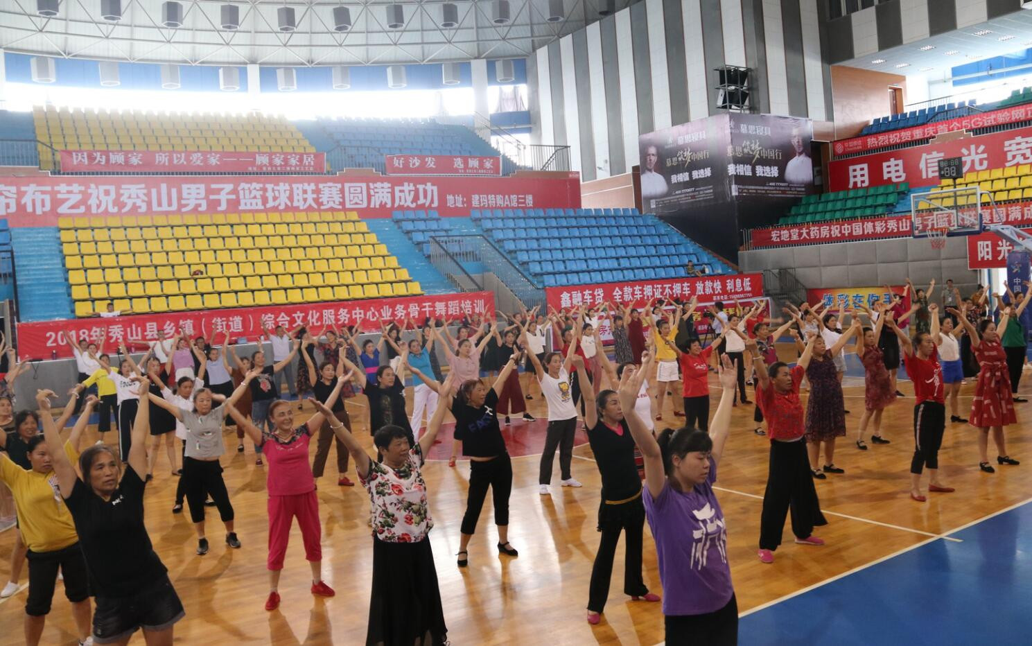 “一、二、三、四,好,拍手,轉圈,比個愛心…” “哈哈哈哈哈……動作有點快,但還是很好耍嘞。” 8月31日上午,秀山縣2018年社會體育指導員培訓班及全縣綜合文化服務中心業務骨干舞蹈培訓在縣體育館開班,來自全縣各鄉鎮(街道)的100余名文藝骨干和社會體育指導員到場…