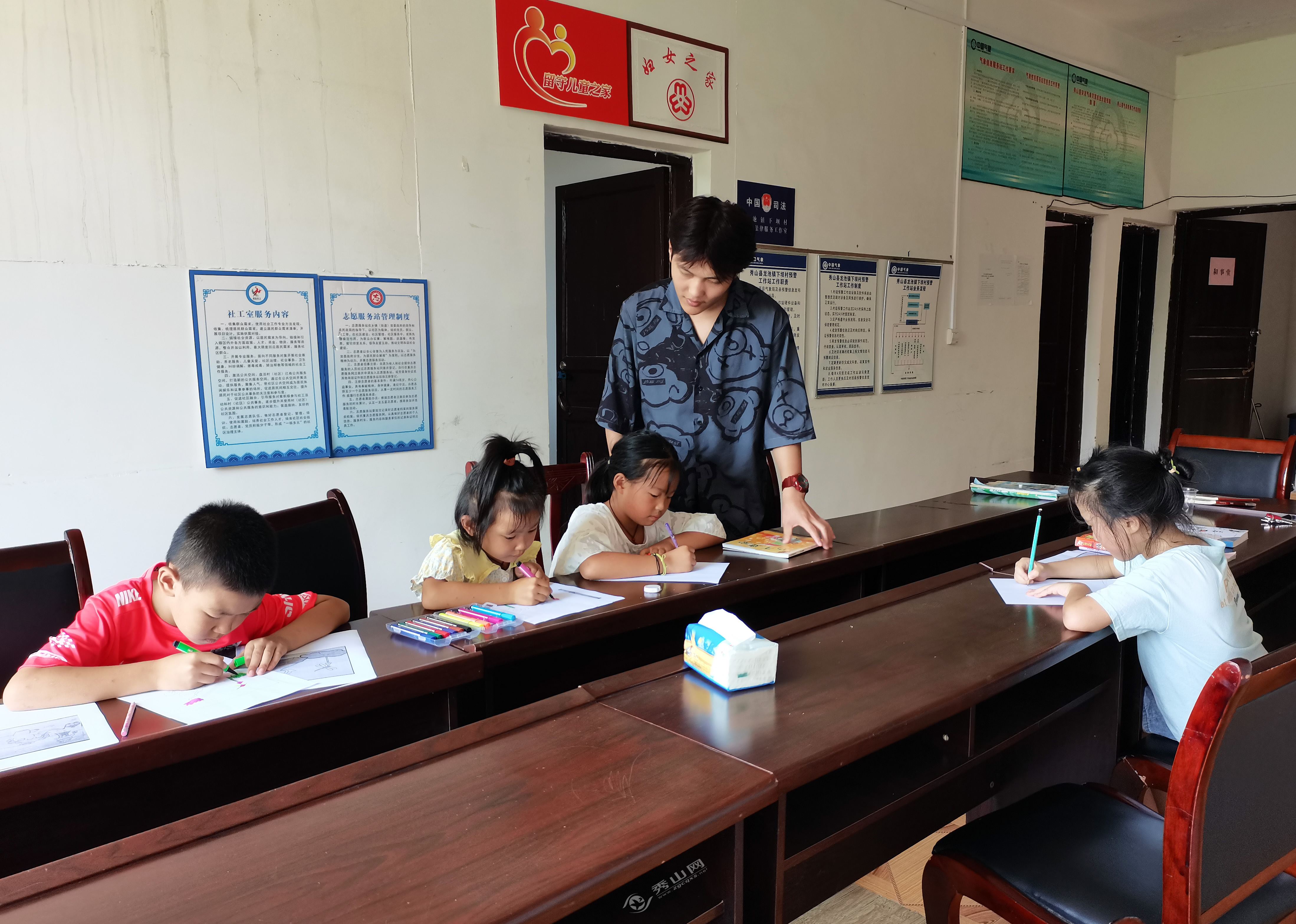 8月6日,記者來到龍池鎮(zhèn)下壩坪村、龍冠社區(qū),在村委會(huì)以及單親女童的家中,大學(xué)生志愿者正在“一對(duì)一”或“一對(duì)多”教授孩子們繪畫知識(shí)、輔導(dǎo)暑期作業(yè)。