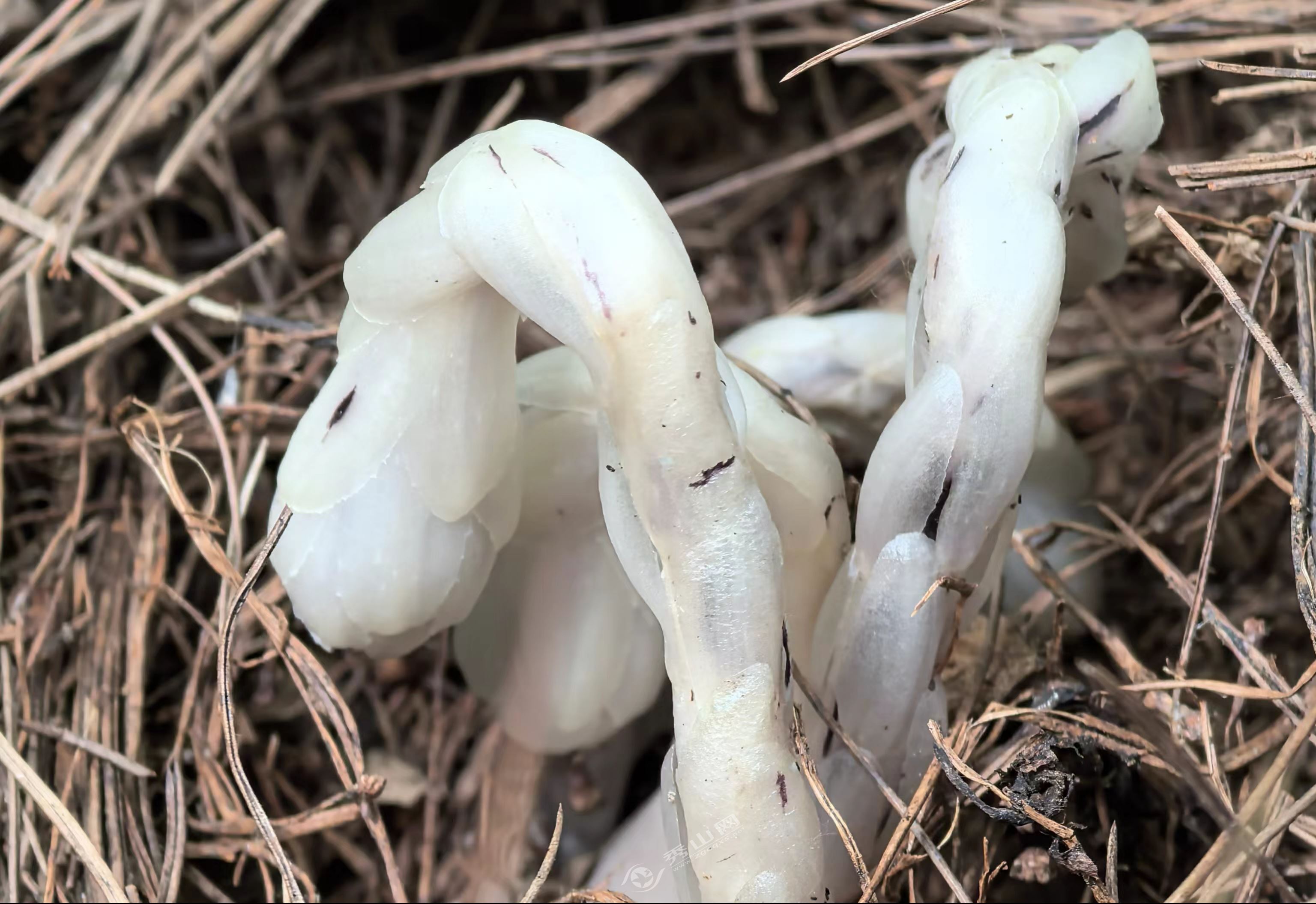 據悉,水晶蘭是多年生草本植物,腐生,與某些真菌共生。其莖葉中完全沒有葉綠素,不能進行光合作用,它一般生活在幽暗潮濕的枯枝落葉間,又名“幽靈草”“夢蘭花”。水晶蘭在2013年列入《中國生物多樣性紅色名錄-高等植物卷》,屬近危物種。
