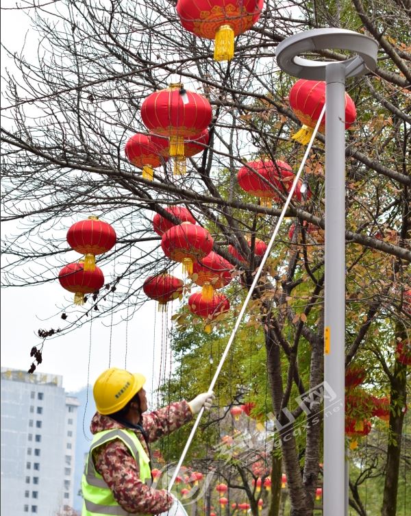 秀山網訊 記者從縣城市管理中心了解到,我縣2025年迎春燈飾布置工作已正式啟動,預計2025年1月1日前全面亮燈。12月23日,記者在渝秀大道、中和廣場等地看到,工作人員正在緊鑼密鼓地進行彩燈懸掛工作,運送、接線、懸掛,分工明確、相互協作,將一串串大紅燈籠、特色蘋果燈、鏤空圓球燈懸掛在道路兩側的樹木上。放眼望去,懸掛完畢的路段已然換上“紅裝”,格外耀眼,喜慶氛圍濃厚。