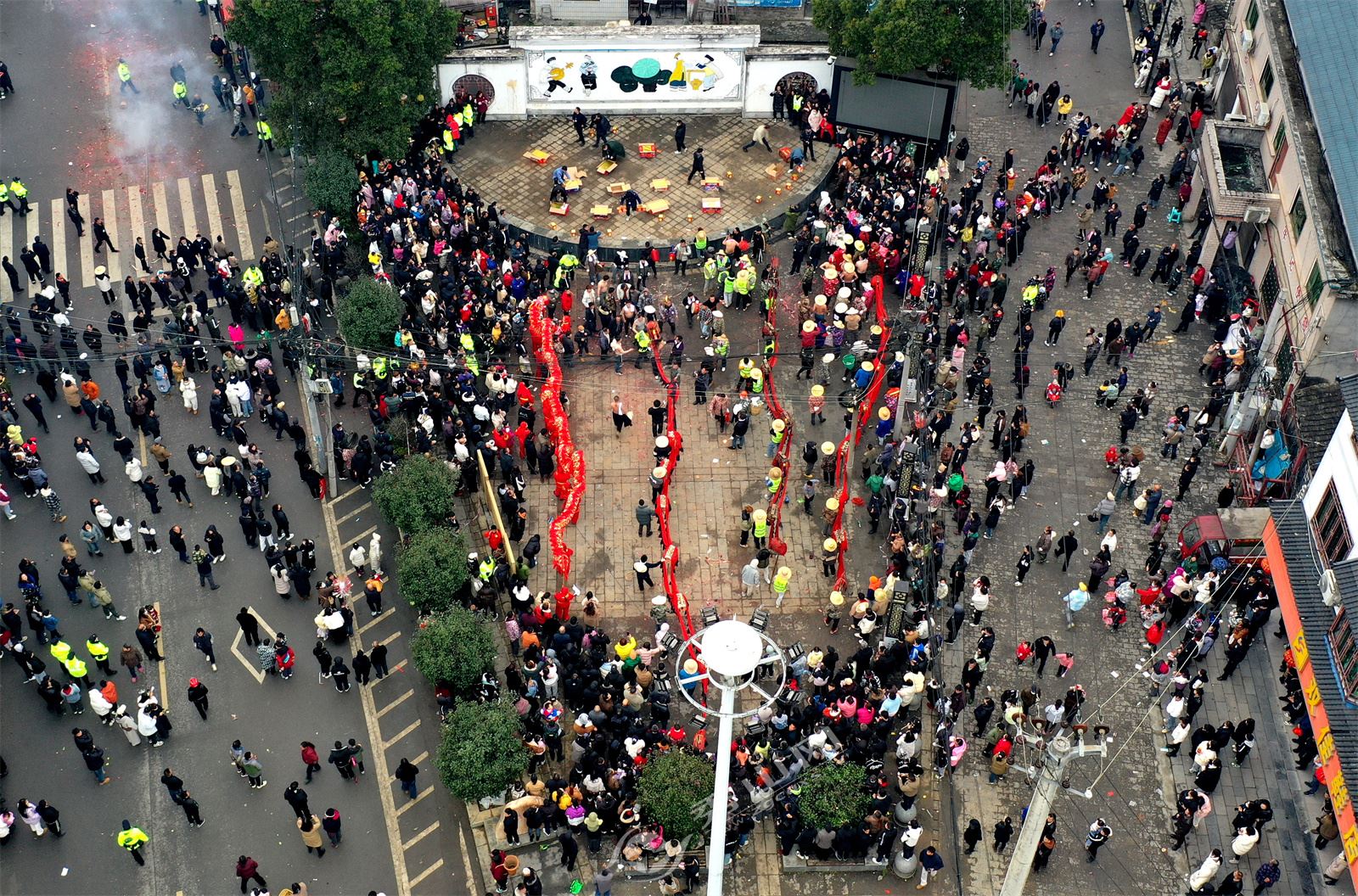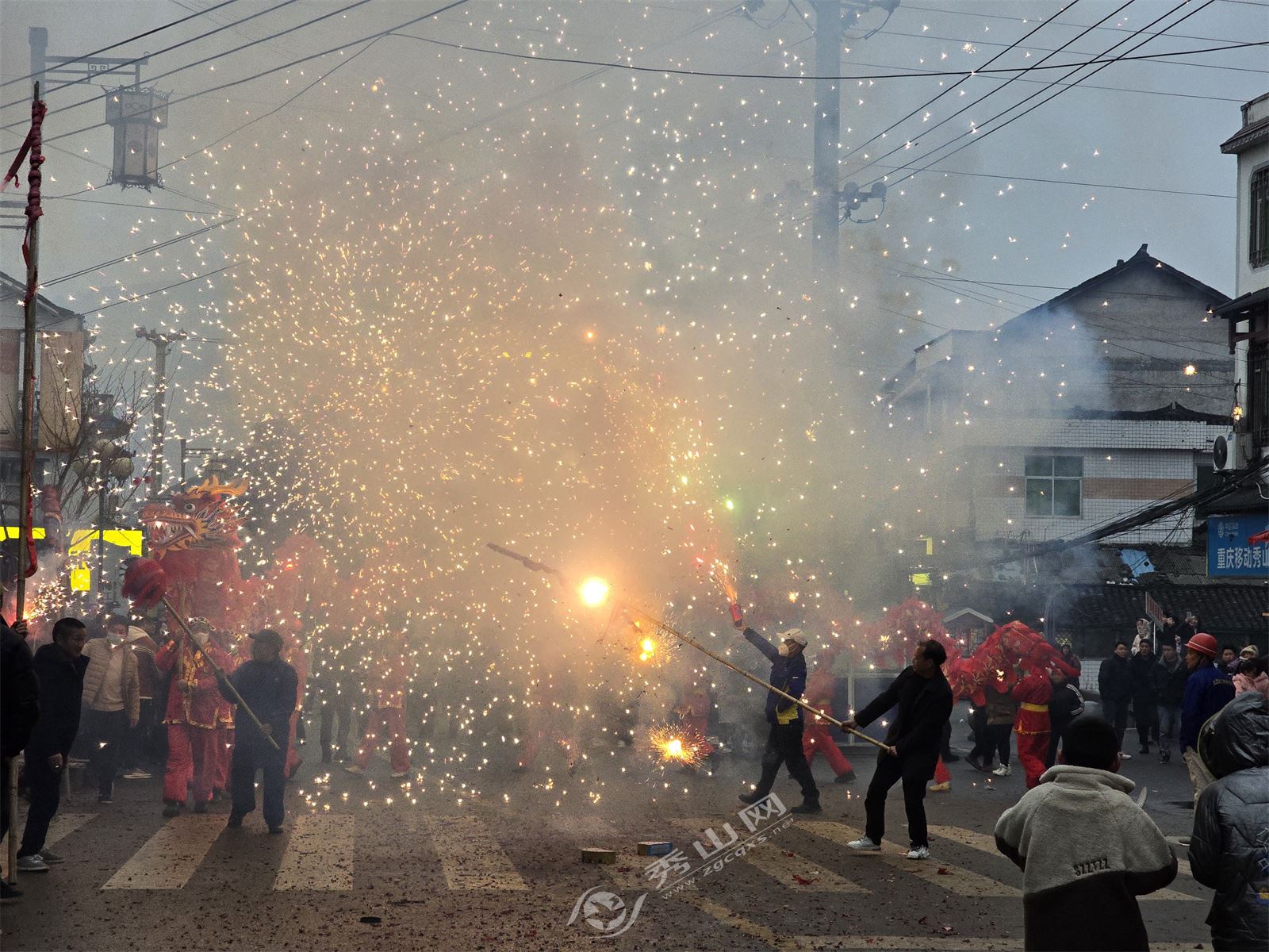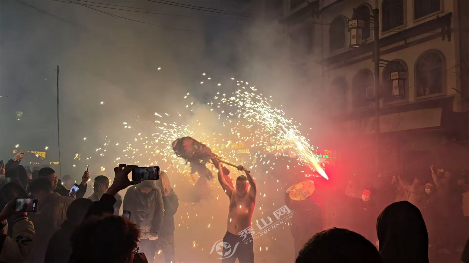 當(dāng)天下午6點,天色漸晚,來自當(dāng)?shù)孛耖g的8條“火龍”相聚在集鎮(zhèn),進(jìn)行巡游表演,為沿街居民送去喜慶、送去吉祥、送去新春祝福,祈福風(fēng)調(diào)雨順、平安幸福。隨著夜色漸濃,“炸龍燈”表演輪番上陣,鞭炮聲、禮炮聲震耳欲聾,現(xiàn)場人頭攢動,熱鬧非凡。炸龍燈隊伍穿梭在狹窄的巷道和寬闊的廣場上,舞動著龍燈,擺出各種姿勢,時而盤旋上升,時而俯沖下降,時而翻滾跳躍。