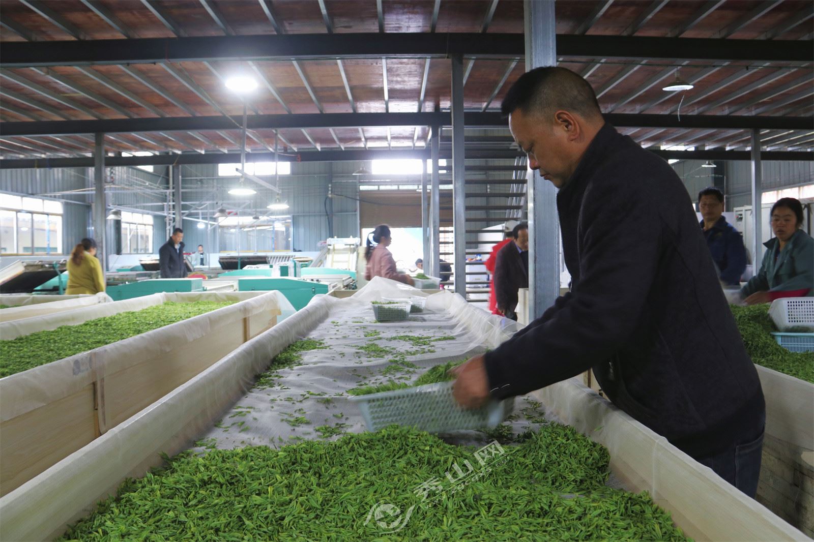 在制茶加工車間,一臺臺殺青機、揉捻機、烘干機等設備正有條不紊地生產著,經過攤青、殺青、揉捻、干燥等一系列工序,逐漸變成散發著濃郁香氣的成品茶,次日便能進行銷售。