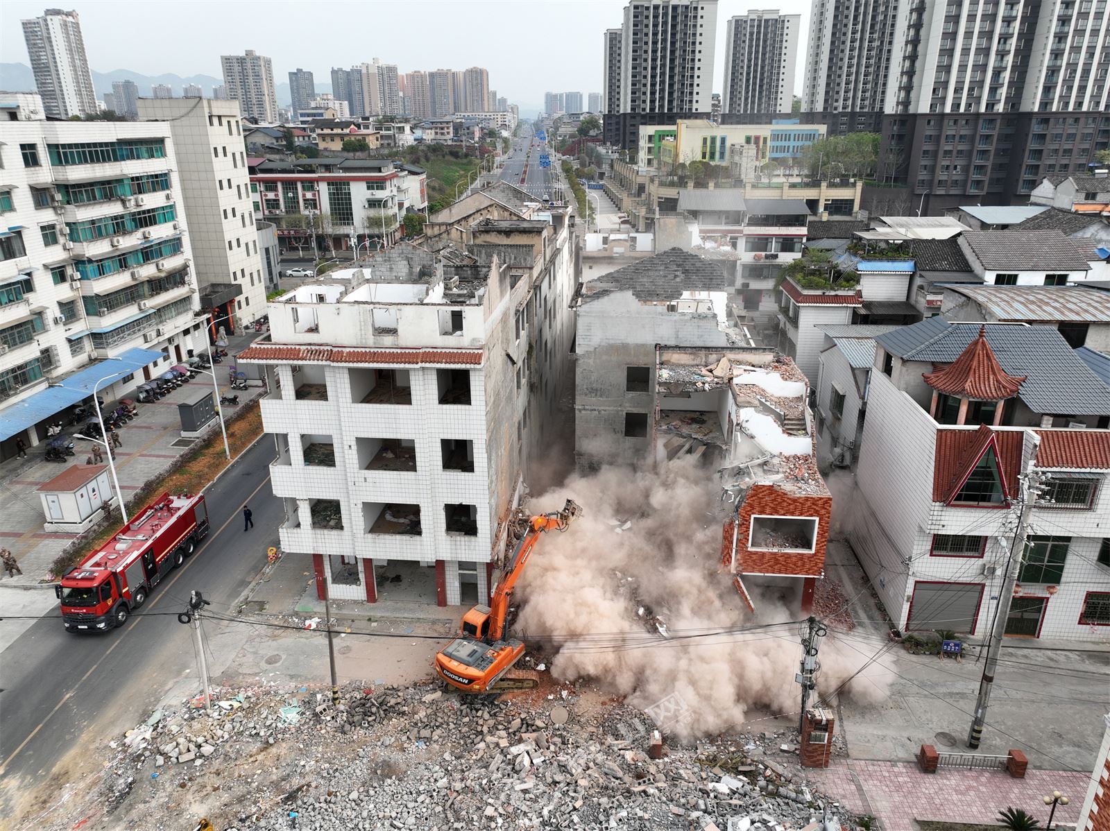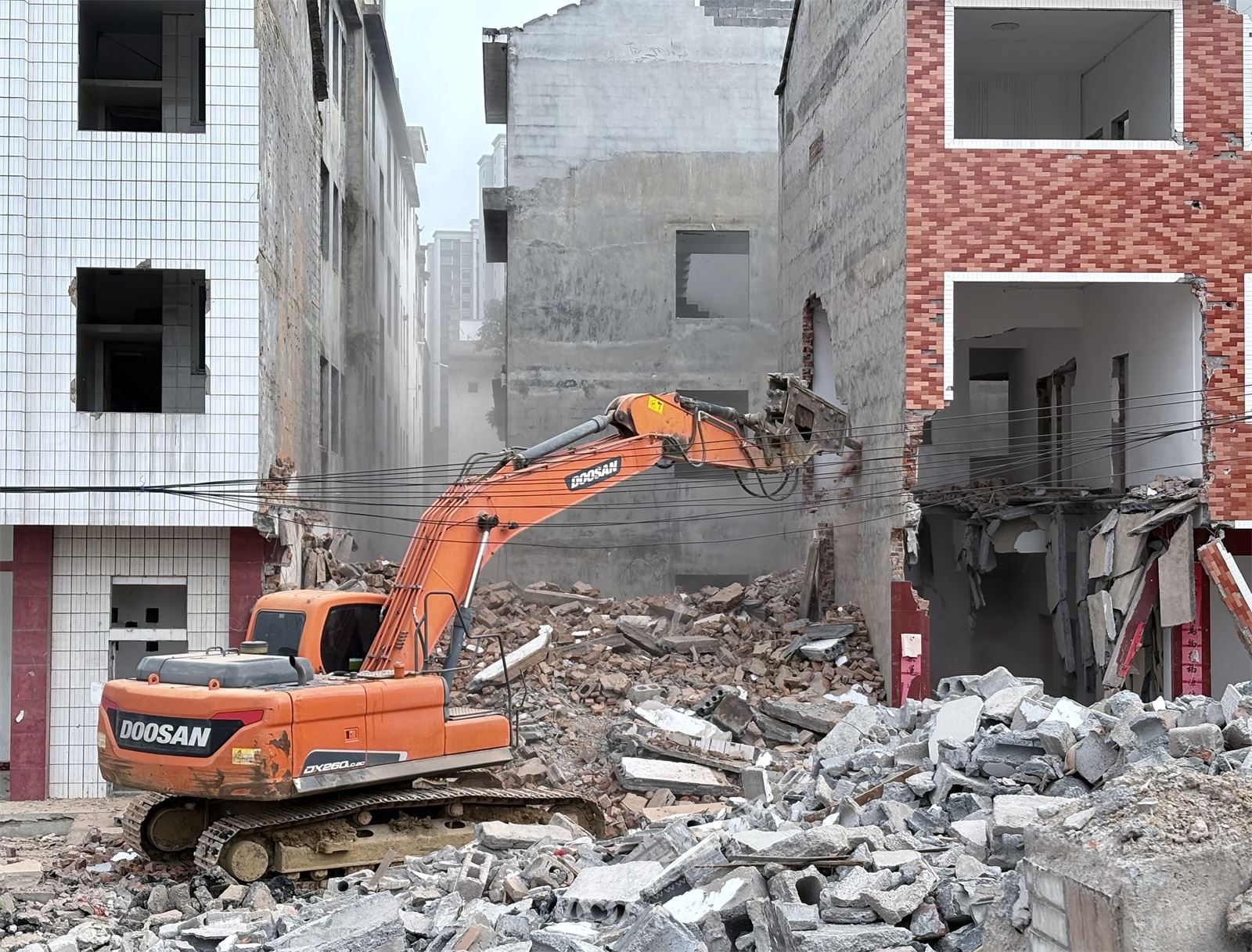 拆除現(xiàn)場(chǎng),工作人員拉起警戒線,破碎機(jī)、挖掘機(jī)協(xié)同作業(yè),對(duì)已清空房屋進(jìn)行拆除。橘紅色的機(jī)械臂精準(zhǔn)擊打承重墻,墻體在轟鳴聲中層層剝落。同時(shí),消防車、環(huán)衛(wèi)車聯(lián)合作業(yè),有效將揚(yáng)塵污染控制在最低限度。