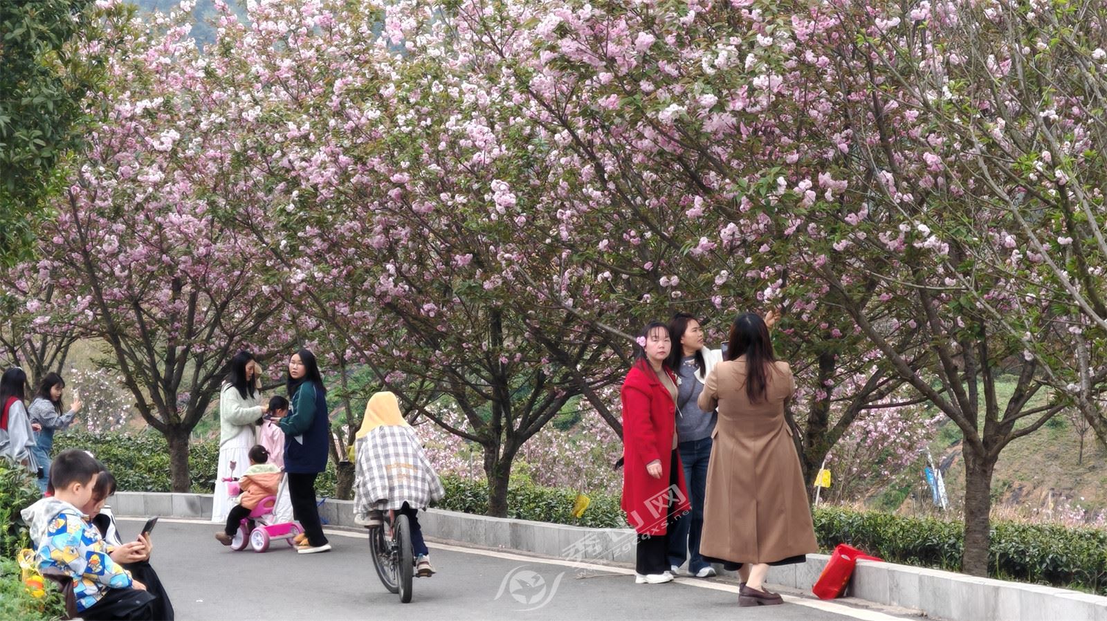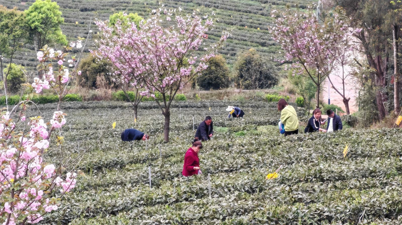 走進櫻花茶園,青翠的茶樹映襯著淡紅的櫻花,游客穿梭在茶樹間,拍照打卡,感受茶香,好不愜意?;乩?,一排排茶樹郁郁蔥蔥,綠意盎然,茶農忙著采摘新芽,花香伴著茶香,構成了一幅幅“櫻花樹下采茶忙”的美麗畫卷。