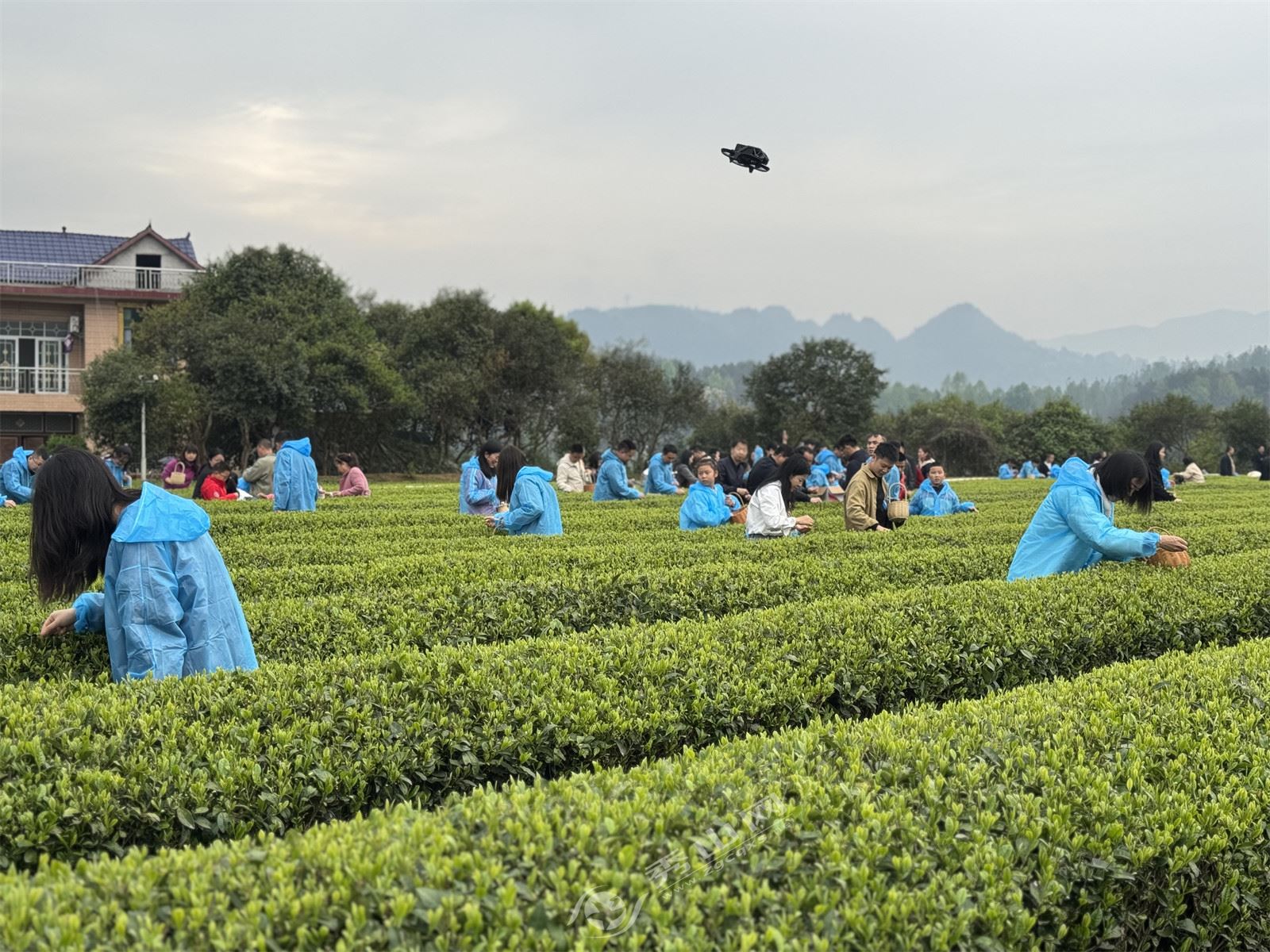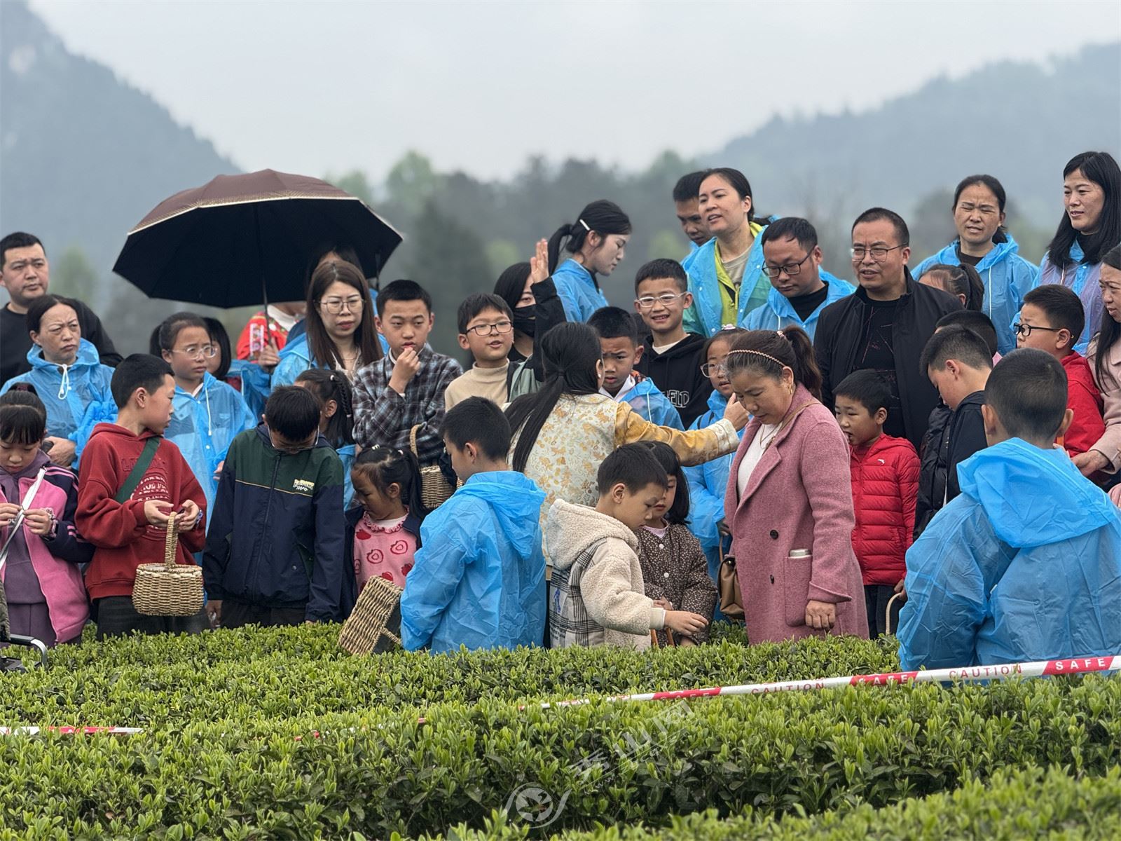 早上九點,游客在老師的指導下學習茶葉采摘技術,并化身“茶農”采摘春茶鮮芽。