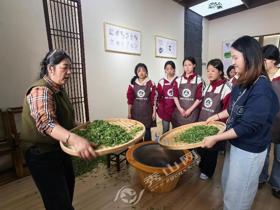活動中,非遺傳承人陳仲元現場演示茶葉炒制與揉捻技藝,師生們認真觀摩、動手實踐,在氤氳茶香中學習傳統制茶工藝。鐘靈茶廠法人鄧林秋以優雅的茶藝表演,詮釋了“和、敬、清、寂”的茶道精神,并與學生互動分享沖泡技巧。從一片鮮葉到一盞清茶,師生們不僅體會到制茶的匠心,更深刻感受到茶文化蘊含的寧靜致遠、禮敬自然的人文內涵。