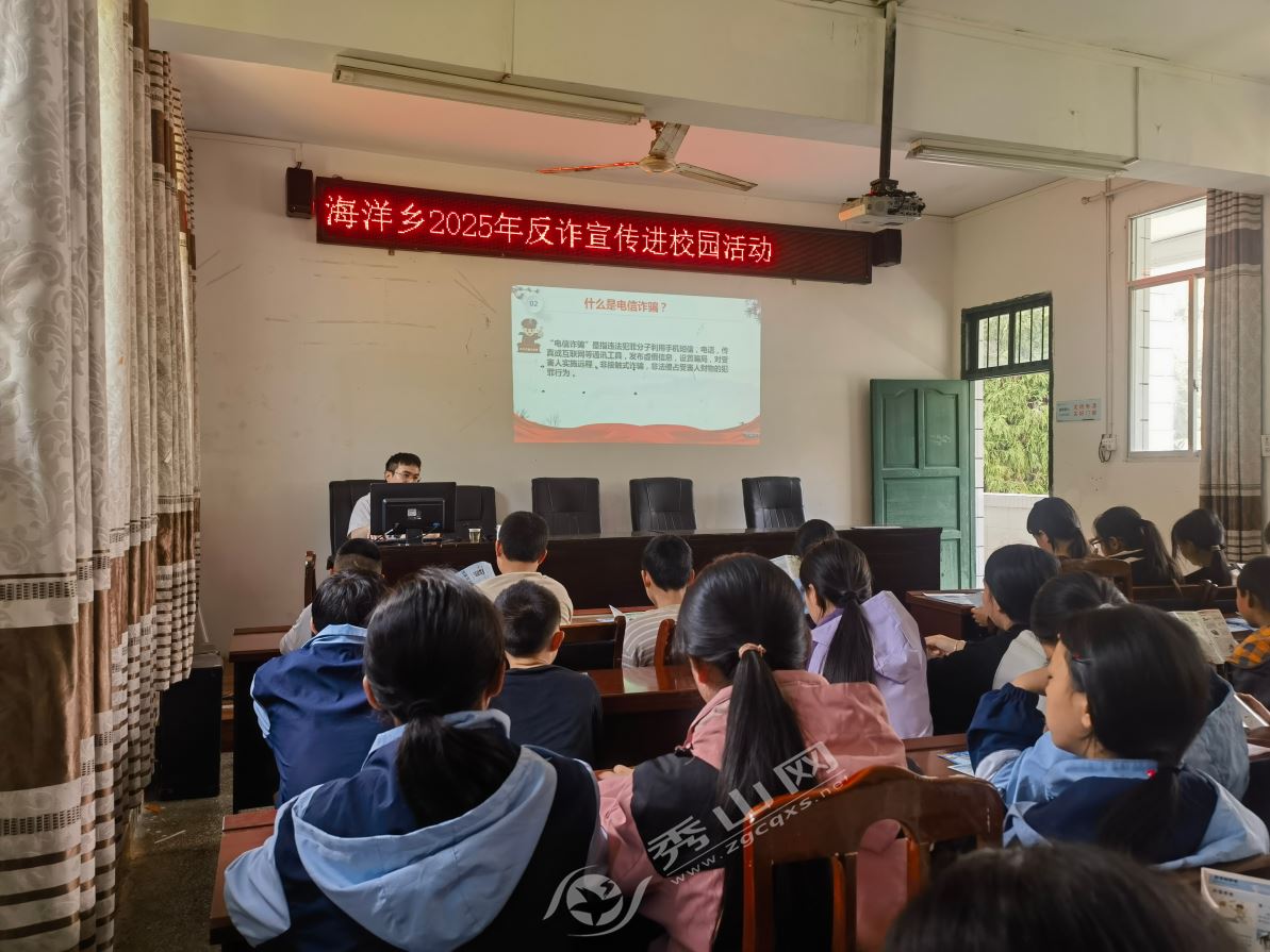 秀山網(wǎng)訊 為提升青少年防范電信網(wǎng)絡(luò)詐騙的意識(shí)和能力,近日,海洋鄉(xiāng)政府在海洋鄉(xiāng)中心校多媒體教室舉辦反詐宣傳進(jìn)校園活動(dòng),100余名師生參加。