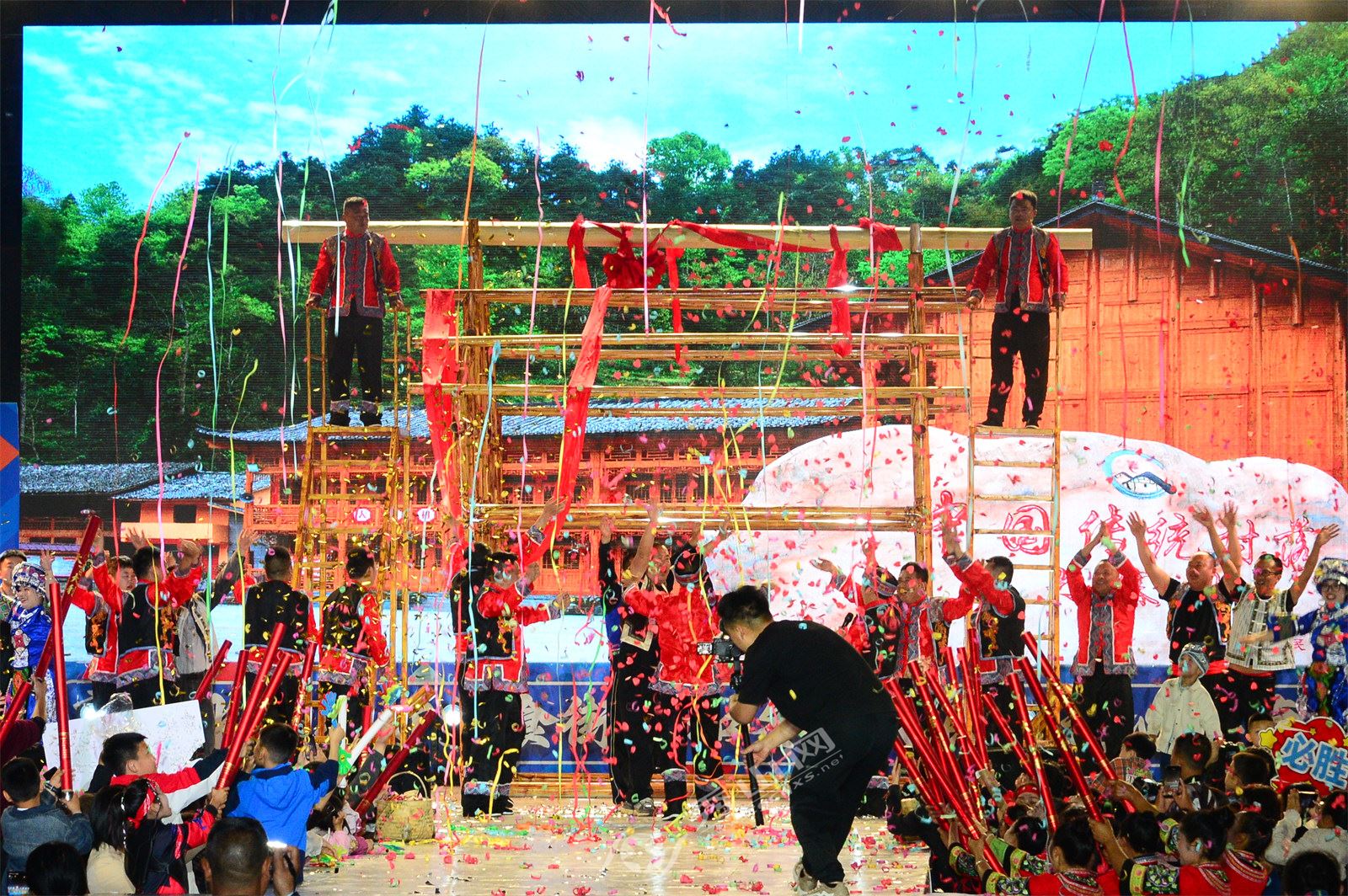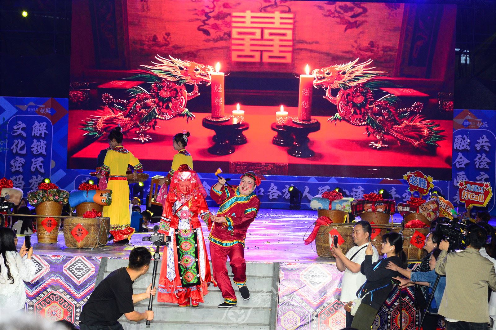 作為繼清溪場街道與溶溪鎮比拼后的第二場活動,溪口鎮與龍鳳壩鎮圍繞“秀春歌、秀春貨、秀春景、秀村舞、秀村趣”五大主題展開激烈角逐。溪口鎮憑《黃楊扁擔》唱響非遺傳承;龍鳳壩鎮《土躍生金 豐登云集》則充分展現了當地特色農產品;《對門哥哥鬧花燈》《錦繡蓮華 金舞乾坤》《抬花轎》《土家上梁》等特色節目將傳統民俗演繹得妙趣橫生,引發觀眾陣陣喝彩。