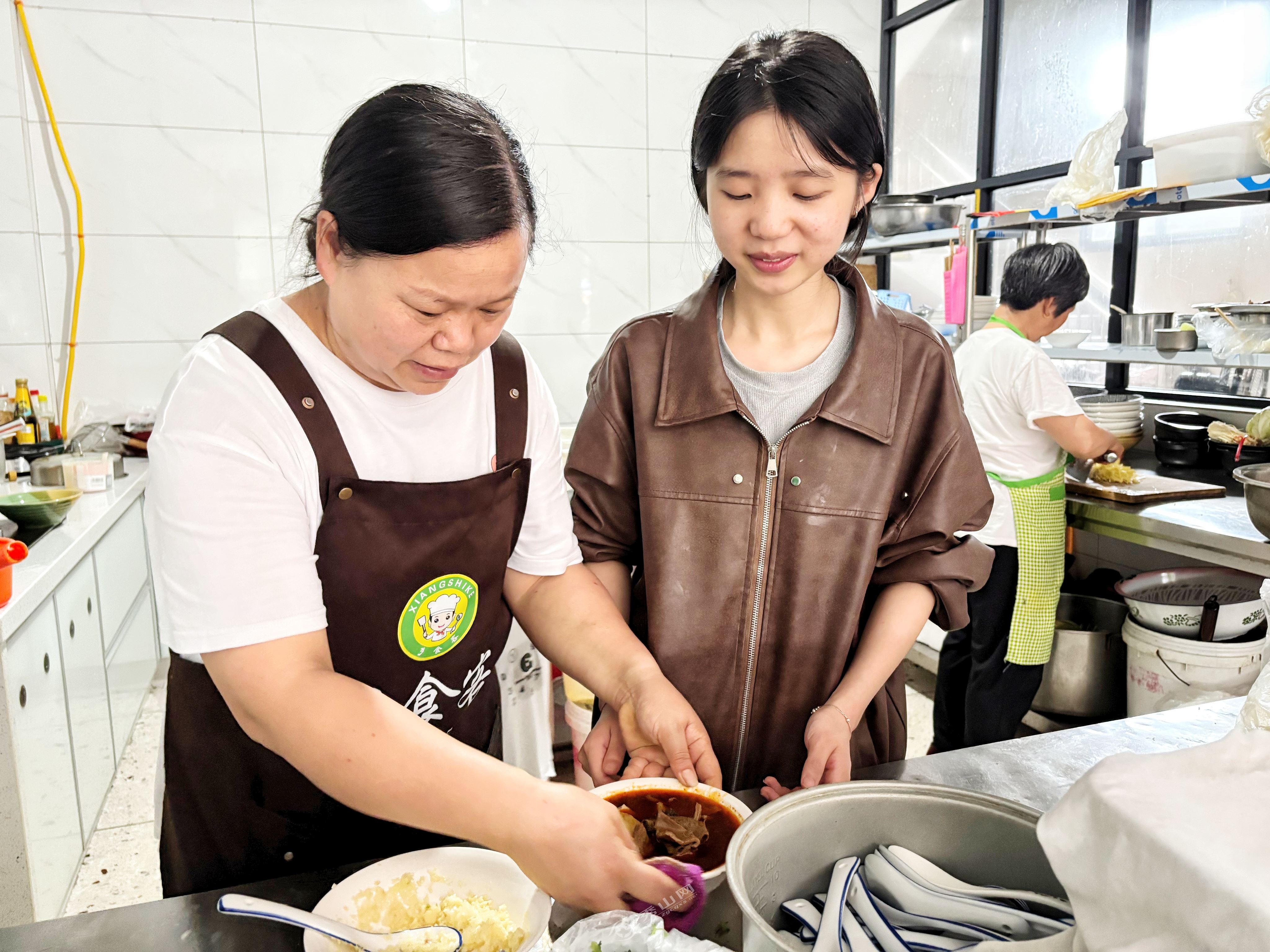 上午,是店里最忙碌的時候。陳芙仙在廚房里忙碌地準備著餐食,兩個侄女則在一旁幫忙上菜、收碗。這間不足50平方米的餐飲店,承載著一家人的希望,是他們最大的經(jīng)濟來源之一。