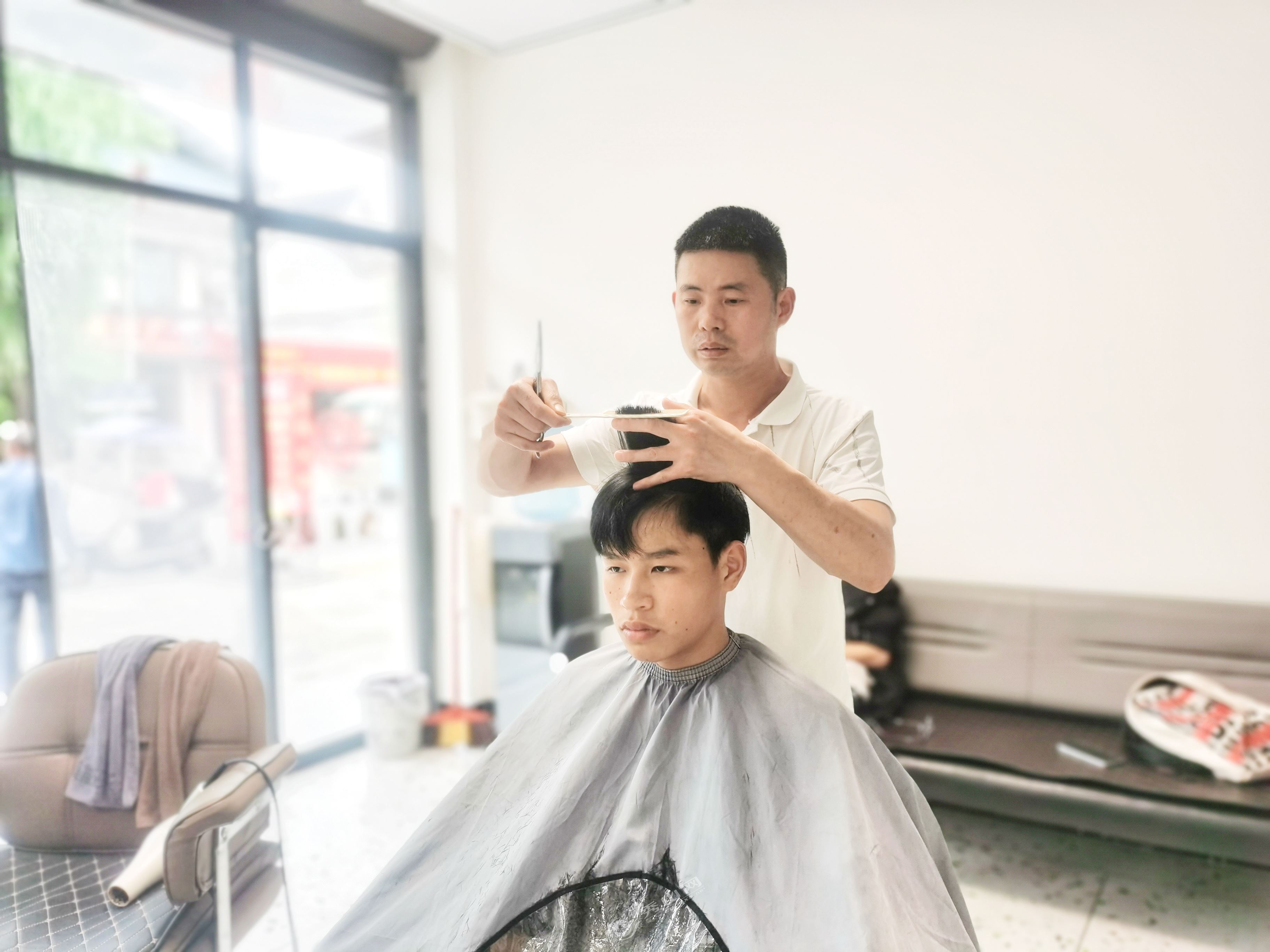 丈夫田仁兵給客人剪頭發(fā)