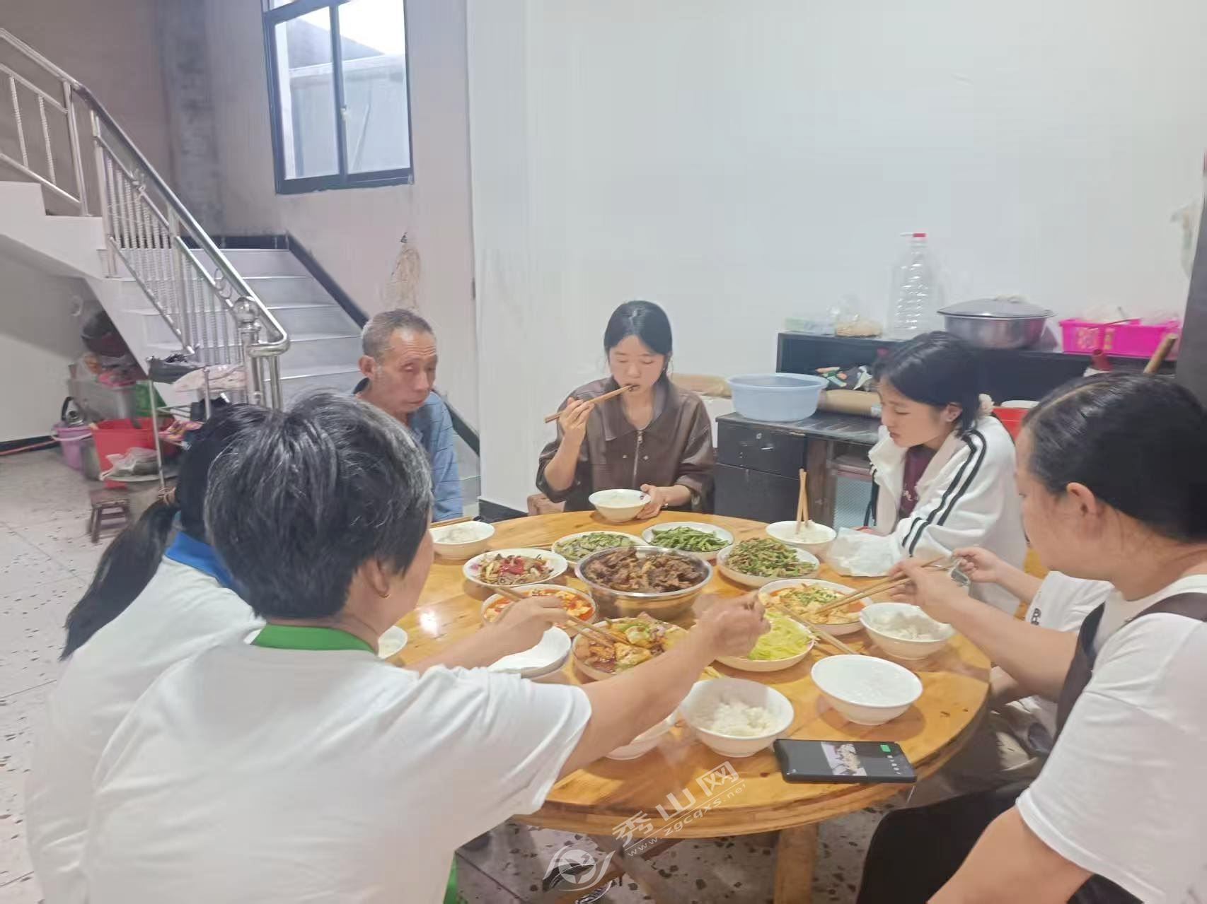 日落時分,“鄉(xiāng)食客”的卷閘門緩緩落下。屋內(nèi),余暉透過窗戶灑在房間的每一個角落,一家人圍坐在一起,其樂融融地吃著晚飯,歡聲笑語回蕩在小小的房間里。