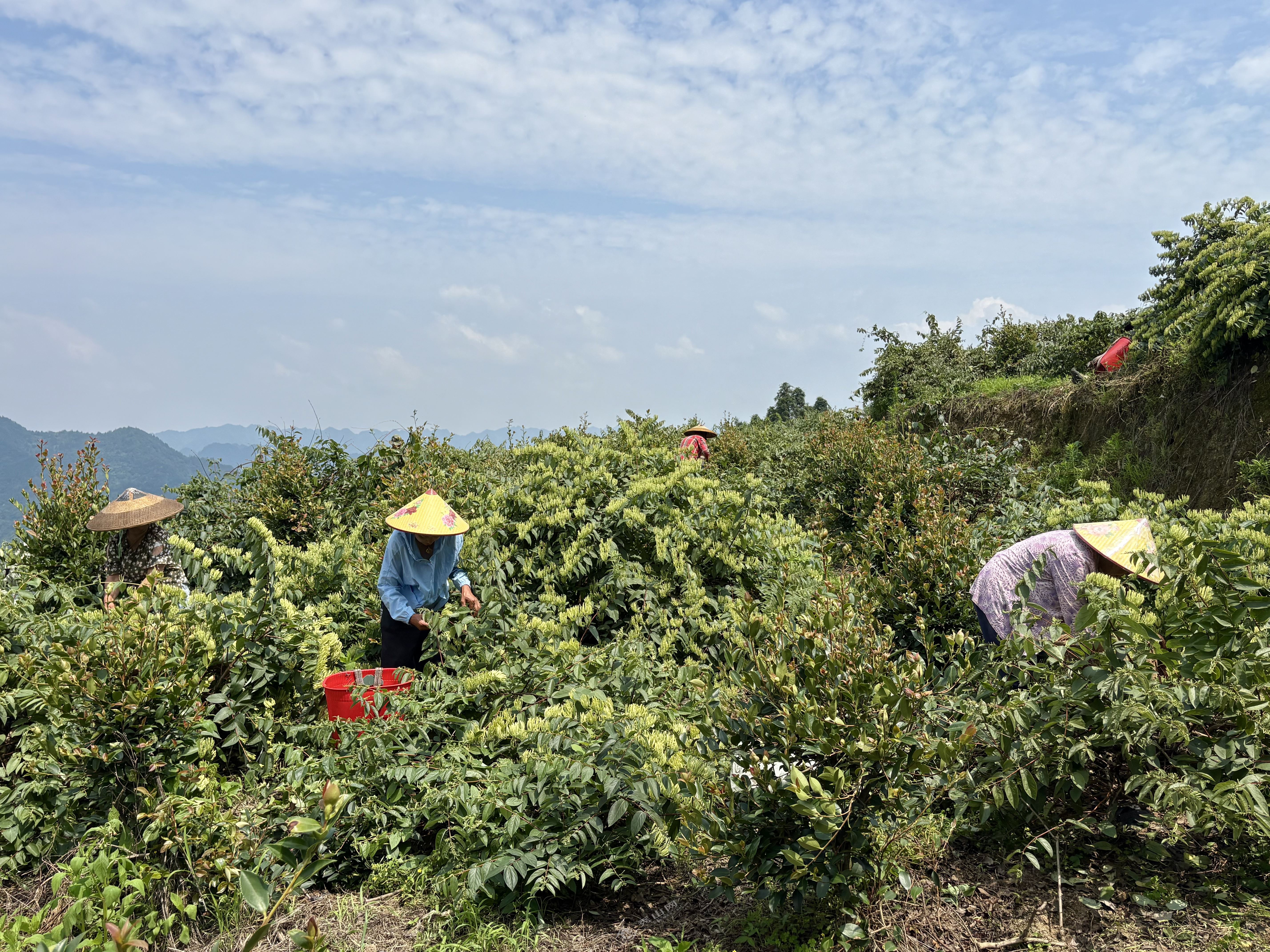 基地里,一片繁忙景象。村民們頭戴草帽,手提竹籃,穿梭在花叢間,快速而熟練地采摘著山銀花,歡聲笑語在山間回蕩,奏響了一曲鄉村振興的豐收樂章。
