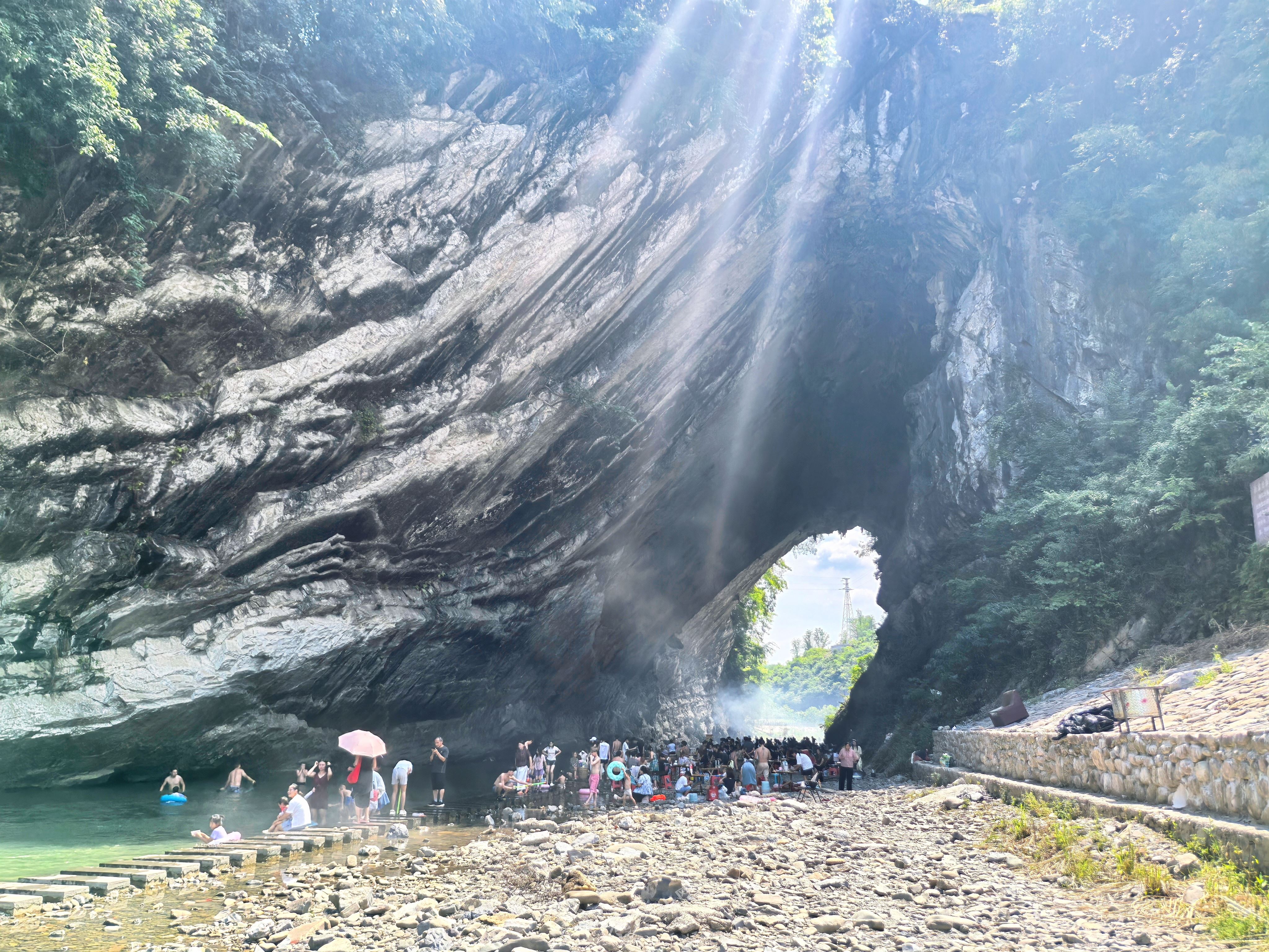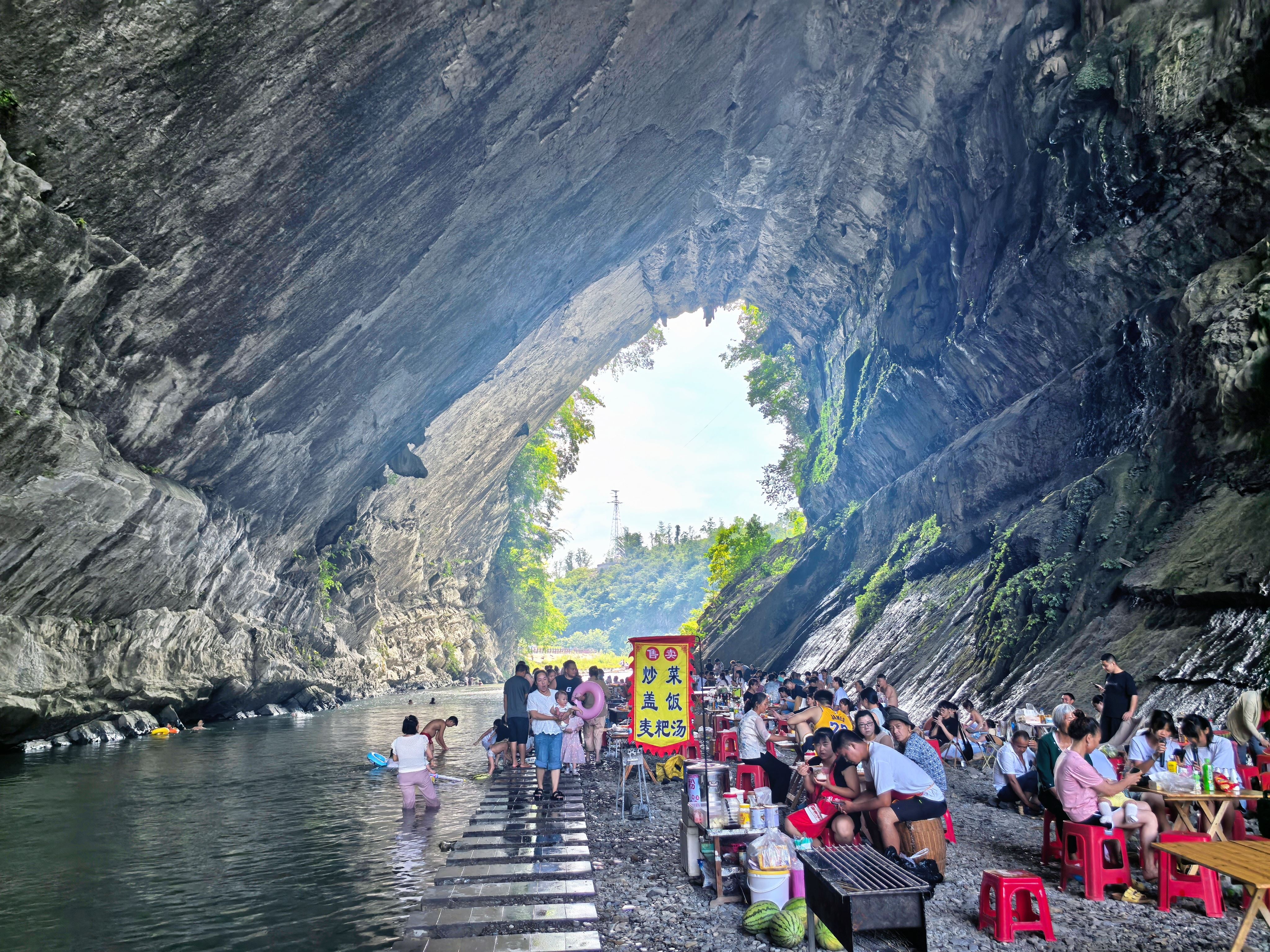 每到周末及節假日,洞內洞外熱鬧非凡,游客們或在河中嬉戲玩水、捉螃蟹,或在寬敞的洞內鋪上野餐墊,享受悠閑的野餐時光;還有一些游客選擇在附近扎營,伴著潺潺流水聲入眠。