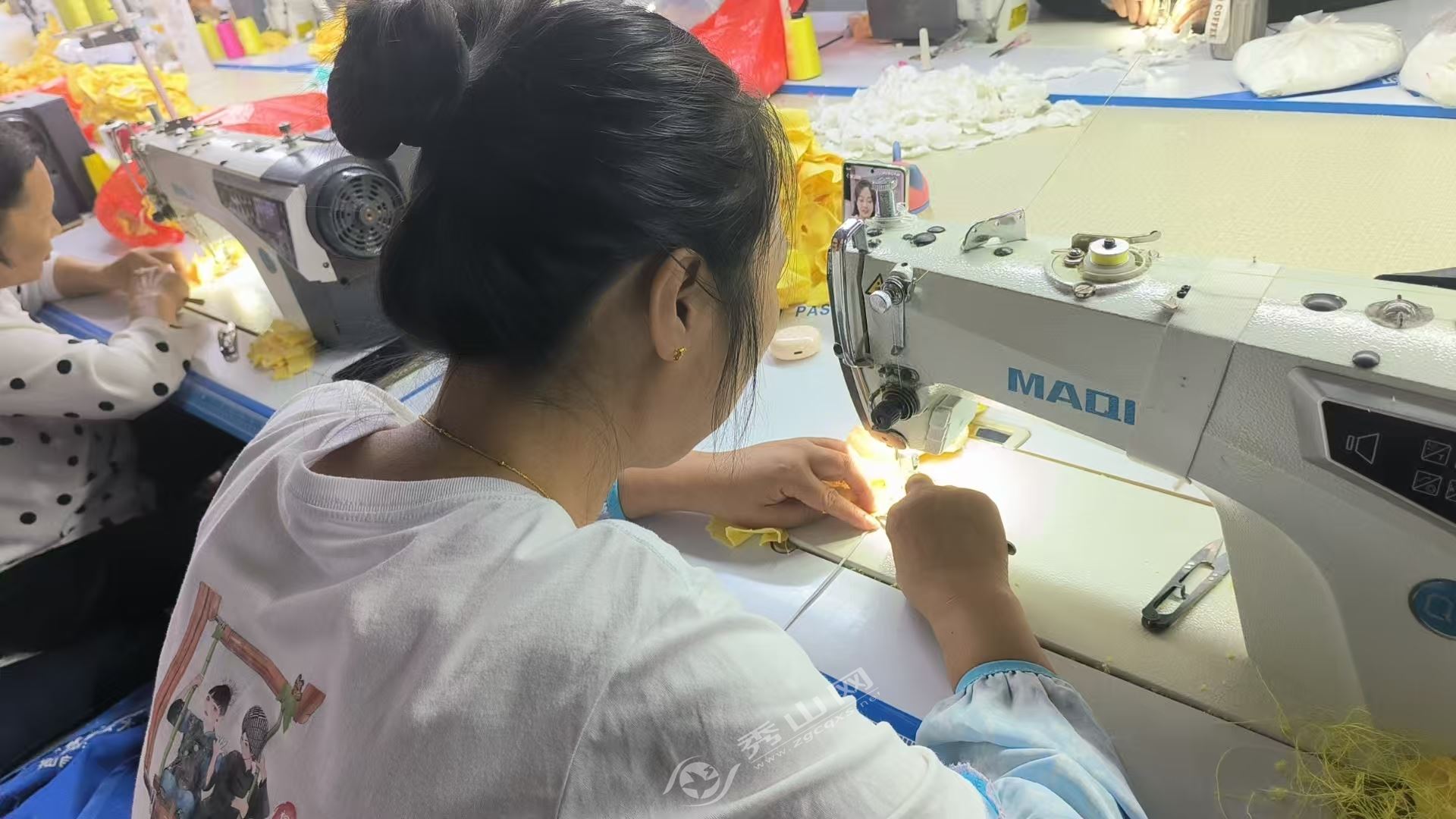 目前,車間以生產毛絨玩具為主,產品遠銷美國市場。車間現有20臺生產設備,累計吸納就業幫扶群眾80余人(其中大部分為脫貧戶、低保戶、殘疾人等特殊群體),采取“計件工資+生活補助”的薪酬體系,實行彈性工作制,工人每日出工均可獲得一定生活補助,月均總收入可達2000元以上。