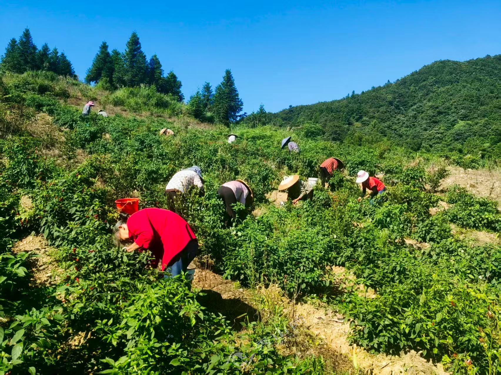 在“零差價”農資和“保姆式”技術的支持下,農戶們紛紛放下顧慮。今年4月,鐘靈鎮140余戶村民跟著李世遠等大戶,把自家的坡地、平地都種上了辣椒,總面積達696畝,昔日的零散地塊連成了“翠綠椒海”。