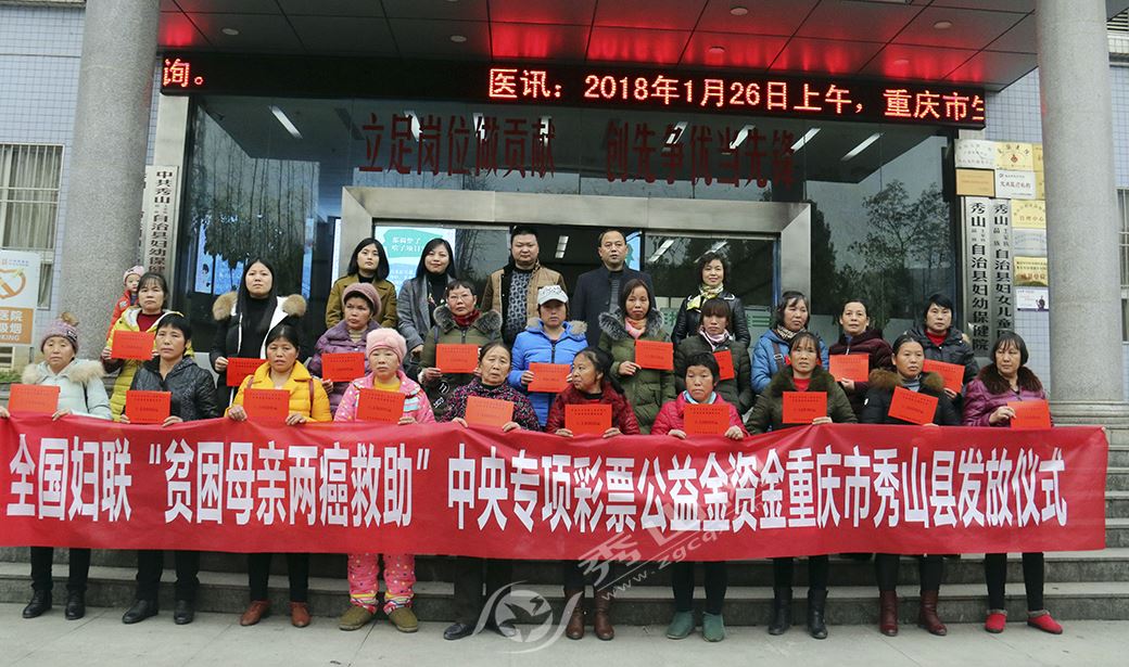 秀山網訊 1月23日,縣婦聯、縣衛計委、縣保健院聯合舉行2017年“貧困母親兩癌救助”及 “母嬰保健專項基金”發放儀式,來自我縣各鄉鎮街道的20名貧困婦女得到“兩癌”患病救助,每人獲得1萬元救助金;10名貧困6-8個月的貧困孕婦,每人獲得3000元救助金。