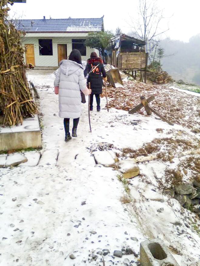 秀山網訊 近日,由于凝凍天氣影響,峨溶鎮大部分地區道路結冰,無法正常通行,但是也有這樣一群人,腳踏冰雪,面迎寒風,頭頂風霜,穿梭于田間地頭,在潔白的雪地上留下了寬窄不一的腳印。