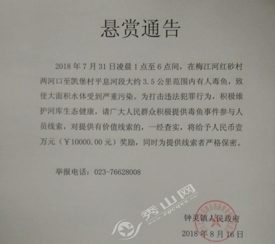秀山網訊 接群眾舉報, 7月31日凌晨1點至6點間,在梅江河紅砂村兩河口至凱堡村平息河段大約3.5公里范圍內有人毒魚,致使大面積水體受到嚴重污染。為嚴厲打擊違法犯罪行為,積極維護河庫生態健康,鐘靈鎮人民政府已聯合公安機關立案偵查,并懸賞一萬元捉拿違法犯罪嫌疑人。據悉,目前該鎮已張貼紙質通告120余份,爭取早日將不法分子繩之以法,同時向廣大群眾做好宣傳,杜絕此類事件再次發生。