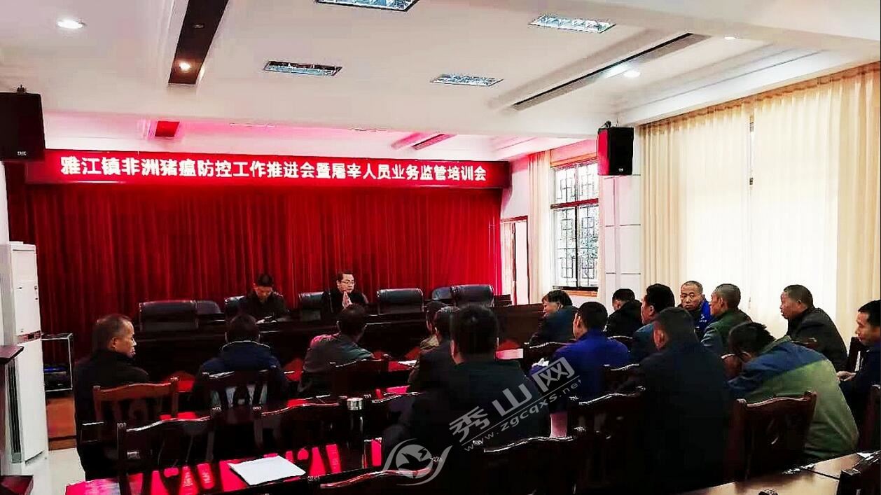 秀山網訊 為切實做好非洲豬瘟防控工作,保障豬肉市場流通安全,增強屠夫安全防控意識。11月8日,雅江鎮召開非洲豬瘟防控工作推進會暨屠宰人員義務監管培訓會。轄區內屠夫20余人參加了本次會議。