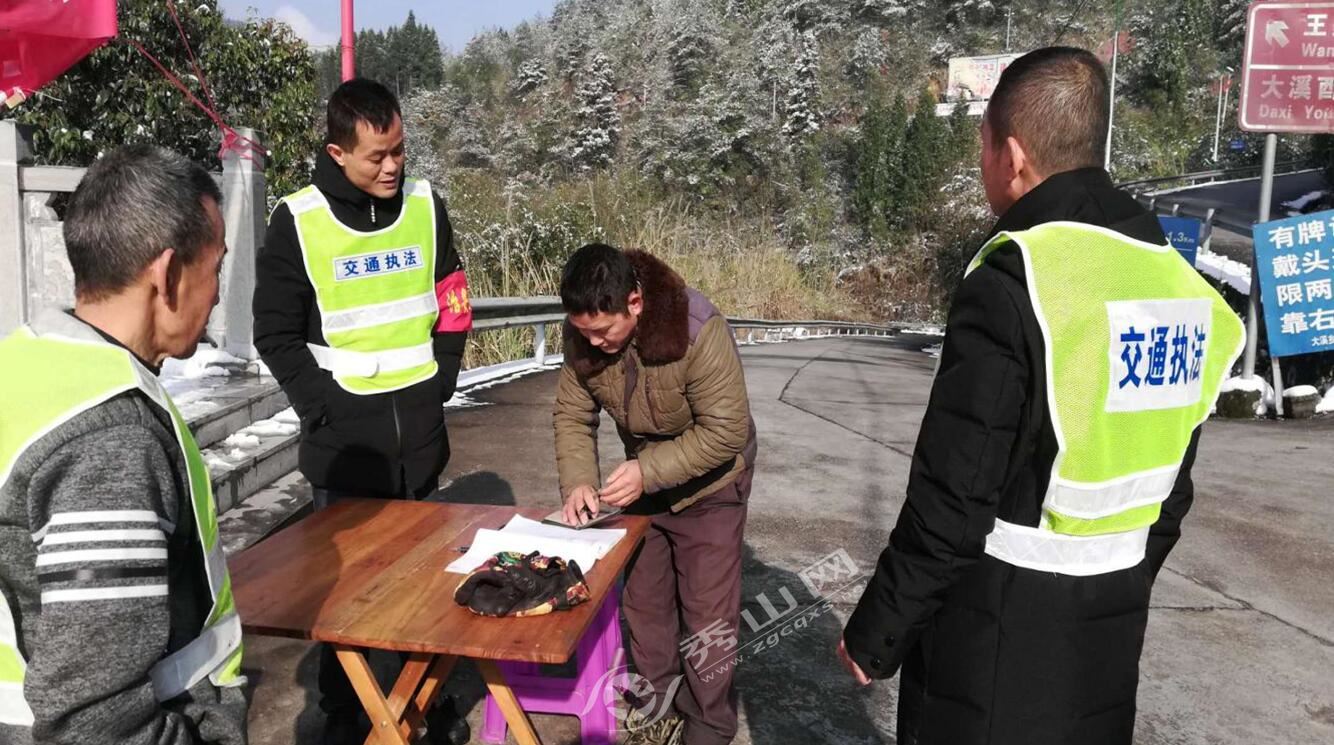 秀山網訊 元旦期間,為做好道路交通安全管理工作,保障駕駛員、乘客與廣大群眾安全出行,大溪鄉工作人員冰雪天上路開展交通執法檢查。