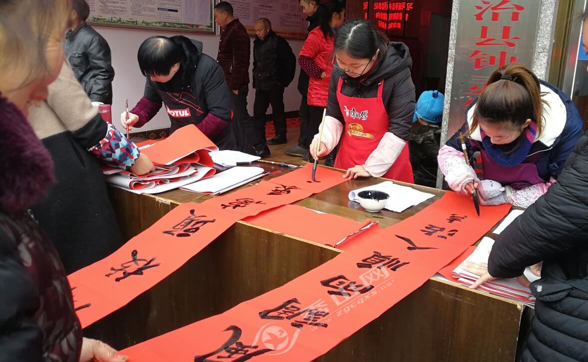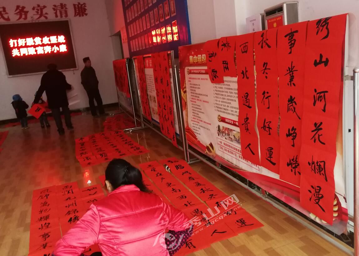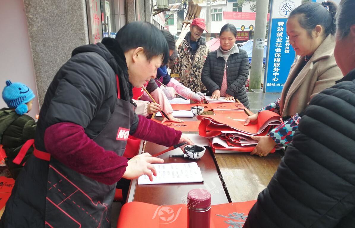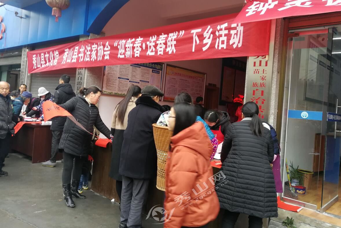 秀山網訊 1月14日,縣文化館、縣書法家協會“迎新春·送春聯”下鄉活動走進鐘靈鎮,書法家現場揮毫潑墨,創作一副副寓意喜慶吉祥的對聯贈送予居民。 活動現場人頭攢動、熱鬧非凡,幾張書桌旁聚滿了等待的居民。送春聯活動不僅為居民傳遞了祝福,同時也讓居民提前感受到了過年的氛圍。