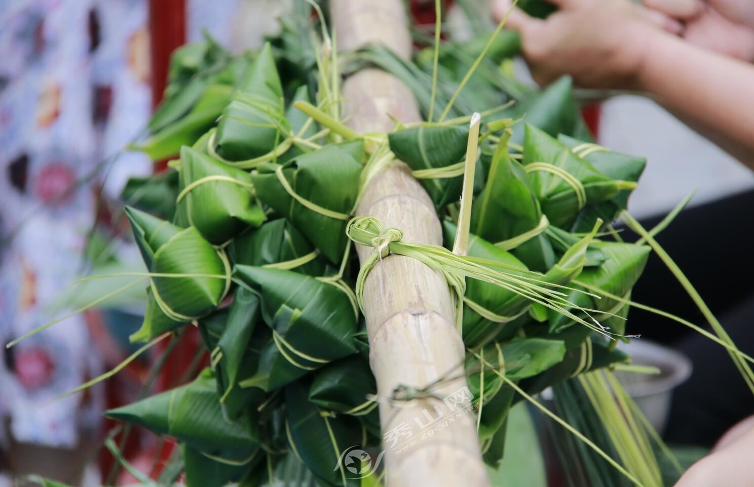 活動現場,數十名婦女同胞齊聚在廣場上,競相比賽包粽子。綠油油的粽葉、白花花的糯米,不一會兒,就在一雙雙巧手下形成一個個形態各異的粽子,掛在棕櫚葉上,圓鼓鼓“肚子”,可愛極了!
