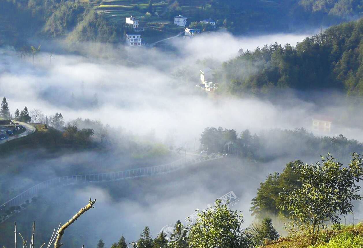 樹林深處有人家,這里屋舍儼然、迷霧蒙蒙,為村莊布上了一層綿綿薄紗,山林亦似嬌羞的舞女蒙上遮羞布,半掩半閉,盡顯身姿,令人垂愛不已。