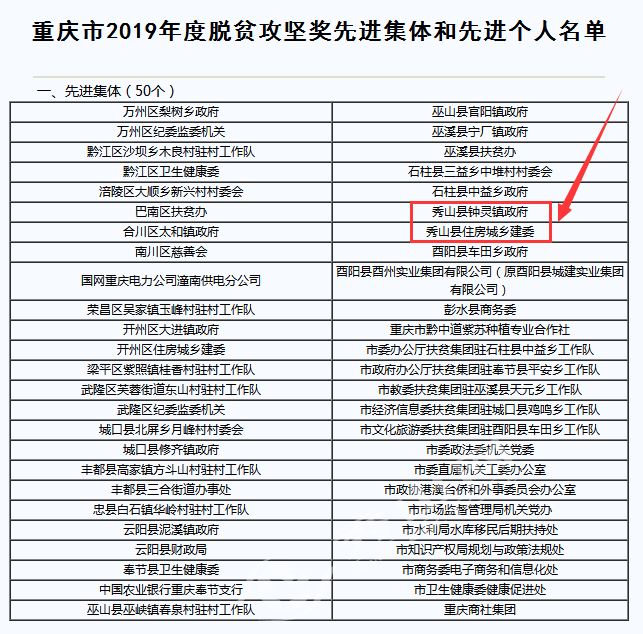 秀山網(wǎng)訊 日前,市人力社保局、市扶貧辦聯(lián)合開展了2019年度重慶市脫貧攻堅獎先進集體和先進個人評選工作。經(jīng)過前期推薦和評選,現(xiàn)擬對50個先進集體、100名先進個人進行表彰,目前已進入公示階段。公示期為5個工作日,從2019年10月12日-10月17日。