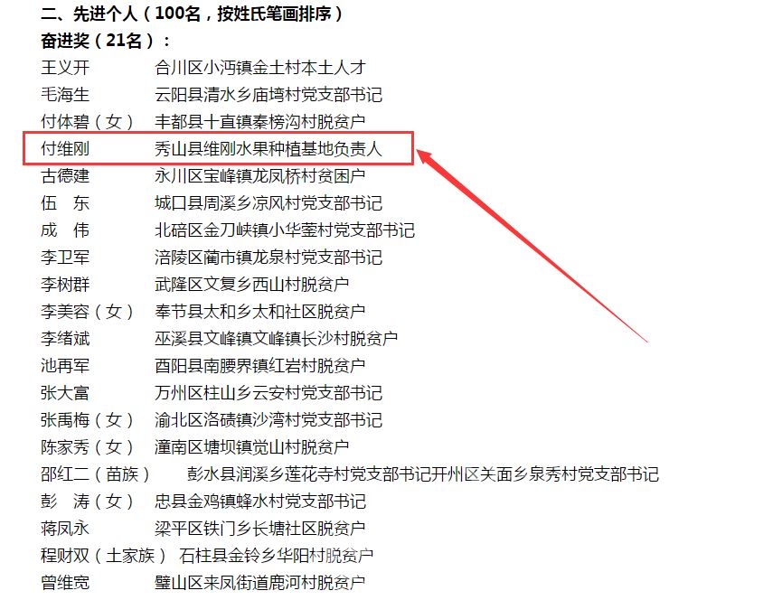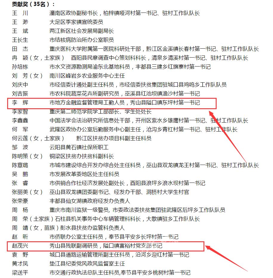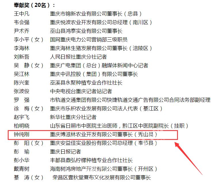 秀山縣鐘靈鎮(zhèn)政府、縣住房城鄉(xiāng)建委入圍先進集體;維剛水果種植基地負(fù)責(zé)人付維剛?cè)雵冗M個人奮進獎;市地方金融監(jiān)督管理局工勤人員、隘口鎮(zhèn)東坪村第一書記李輝,縣殘聯(lián)副調(diào)研員、隘口鎮(zhèn)富裕村黨支部書記趙茂興入圍先進個人貢獻獎;重慶博滋林農(nóng)業(yè)開發(fā)有限公司董事長鐘純剛?cè)雵冗M個人奉獻獎。