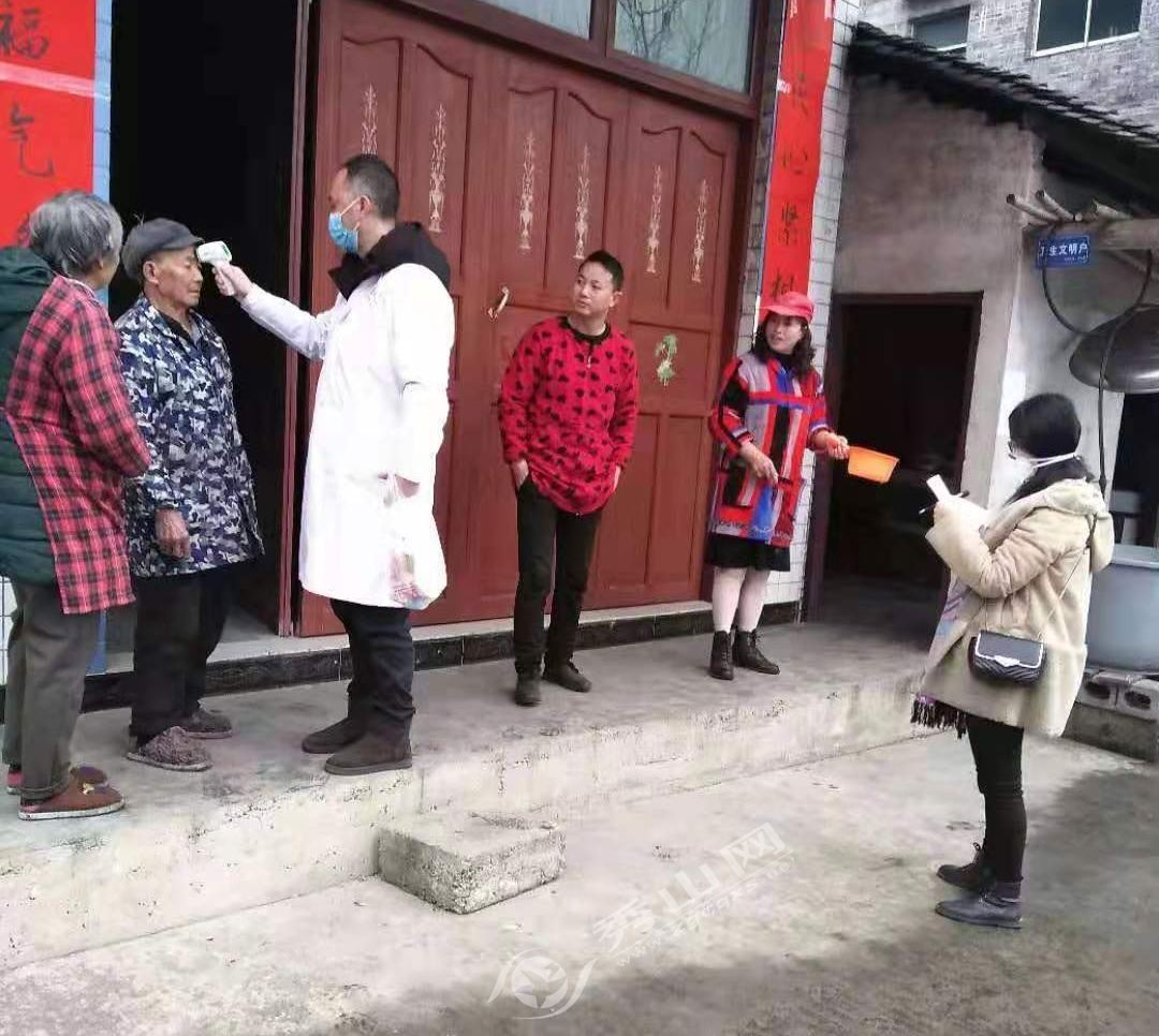 2月5日上午,記者在清溪場鎮龍鳳村看到,鎮村干部正走村入戶,采取張貼標語、播放音頻、上門講解等方式,告誡村民不聚會、不串戶、少出門、戴口罩,并對外省回鄉未達14天的人員進行體溫測量。