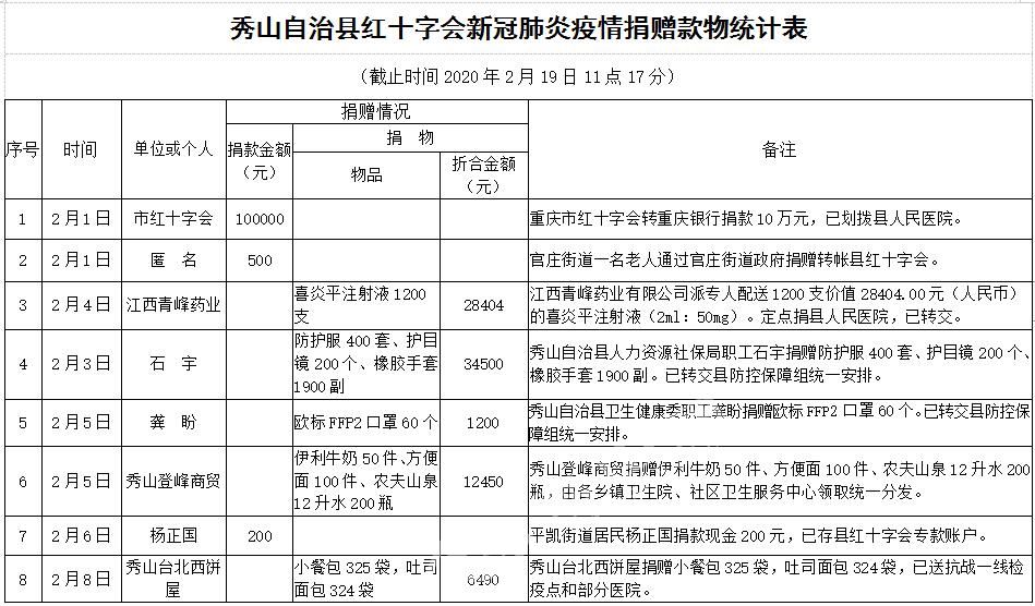自新冠肺炎疫情發生以來,社會各界積極捐款捐物,對我縣疫情防控工作給予了大力支持和援助。截至2020年2月19日11時17分,秀山自治縣紅十字會已累計接收社會捐贈款物共計817624元,其中,捐款348280元,捐物折合價值469344元。
