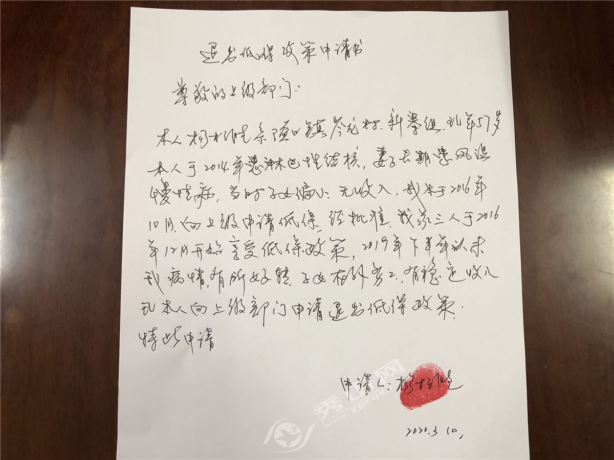 脫貧有了產業,致富有了門路。看著收入不斷增加,日子也越來越紅火,楊松勝想著,不應該再占用“低保戶”的名額,應該把它讓給需要的人。因此,從2019年發展產業之初,楊松勝便和村干部說起了這個想法,現在產業做起來了,楊松勝更是“迫不及待”的向村干部表示一定要退出“低保戶”。2020年3月,楊松勝將親手寫的、按著紅手印的申請書交到了村干部的手中。