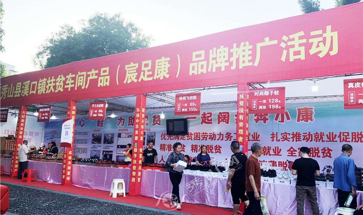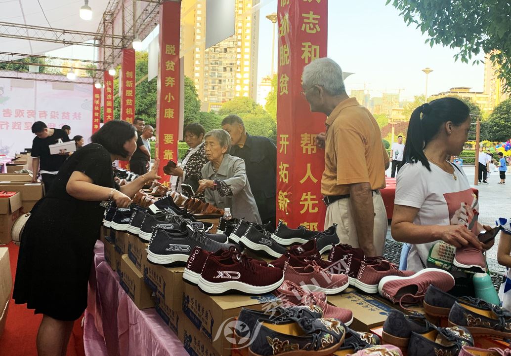 活動現場,產自秀山縣龍洞鞋業有限公司的休閑鞋、皮鞋、椰子鞋等一系列特色產品統一展示,優質的產品、優惠的價格吸引了不少群眾駐足圍觀,大家紛紛上前仔細查看、體驗試穿帶來的產品,一致給予好評。