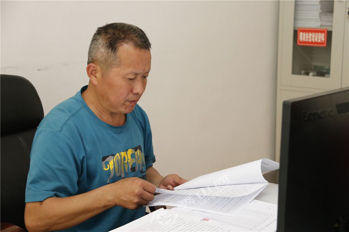 第一書記周勝龍正在整理資料。楊育霖 攝