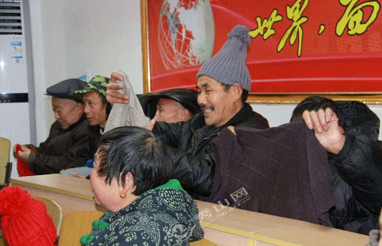 剛領到手套、圍巾和帽子,同學們就迫不及待地戴上了,你看看我,我看看你,臉上掛滿了笑容。老人也高興地戴上了愛心針織帽子。
