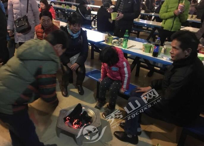 溪口鎮(zhèn)黨委、政府從值班人員處得到此消息以后,第一時間組織鎮(zhèn)安監(jiān)辦、綜治辦、社保所、民政辦工作人員帶上鎮(zhèn)政府所有熱水工具并且馬上采購30箱泡面、20箱水、10袋干炭、15個火盆迅速趕往黃楊便民服務中心將食物及時送到旅客手中,讓滯留旅客在寒冷的冬夜吃上熱氣騰騰的食物。