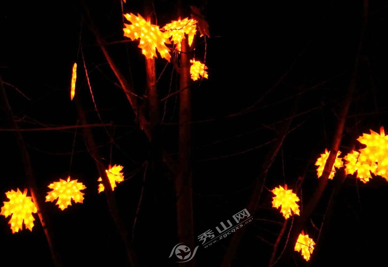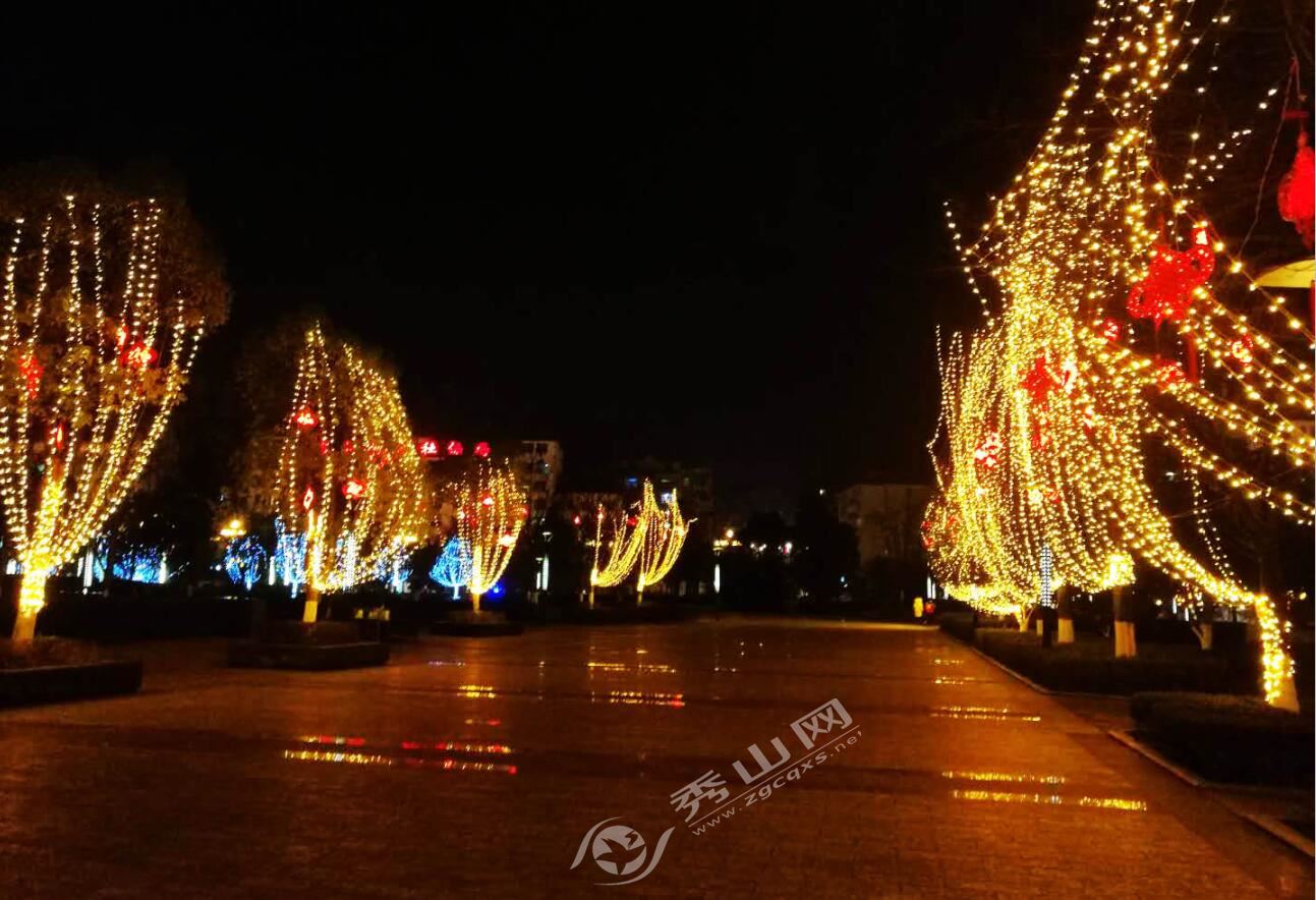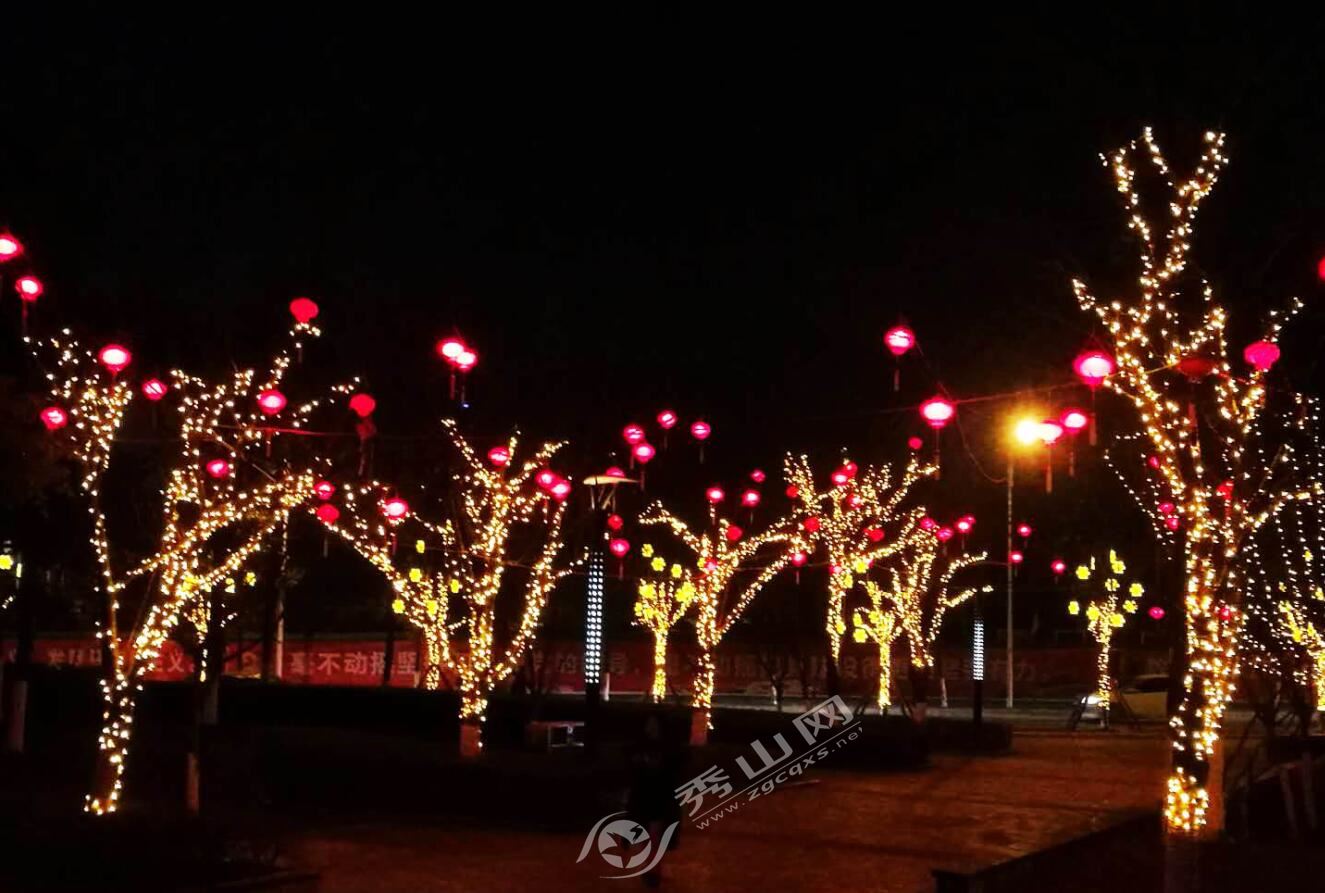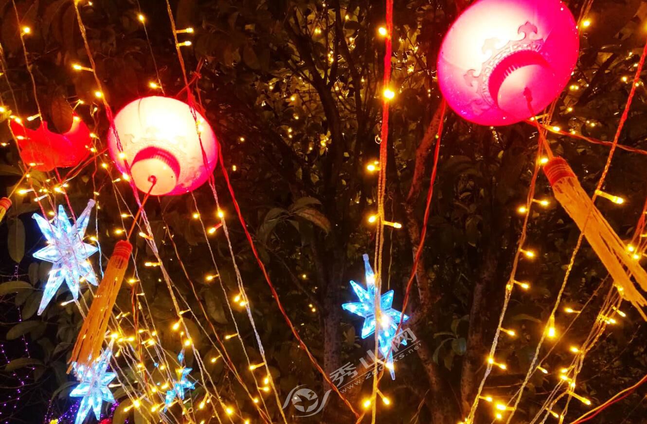 秀山網訊 2月6日晚,記者在中和廣場看到,樹上懸掛的燈飾全都亮起來了。紅的、黃的、紫的……中國結、紅燈籠、黃楓葉……五顏六色的燈光,形狀各樣的飾品,在春節即將來臨之際,為秀城增添了不少年味。