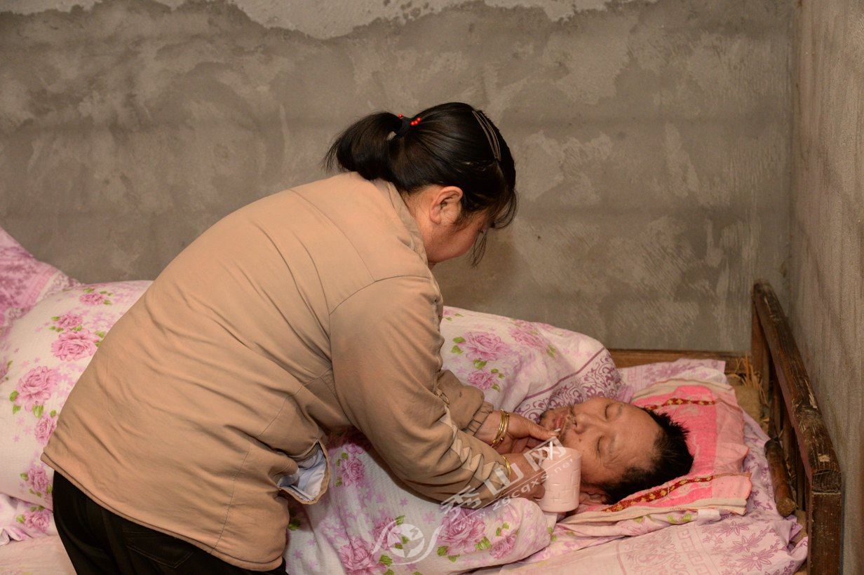 近日,記者來到大溪鄉豐胡村姚水花家看到,干凈整潔的小院里,50歲的姚水花正像往常一樣忙著為丈夫彭明貴擦洗身子。擦洗完身子又幫助丈夫喝水,然后又忙著去做飯、整理家務……姚水花說,自丈夫癱瘓在床以來,她每天都是在這樣的忙碌中度過。