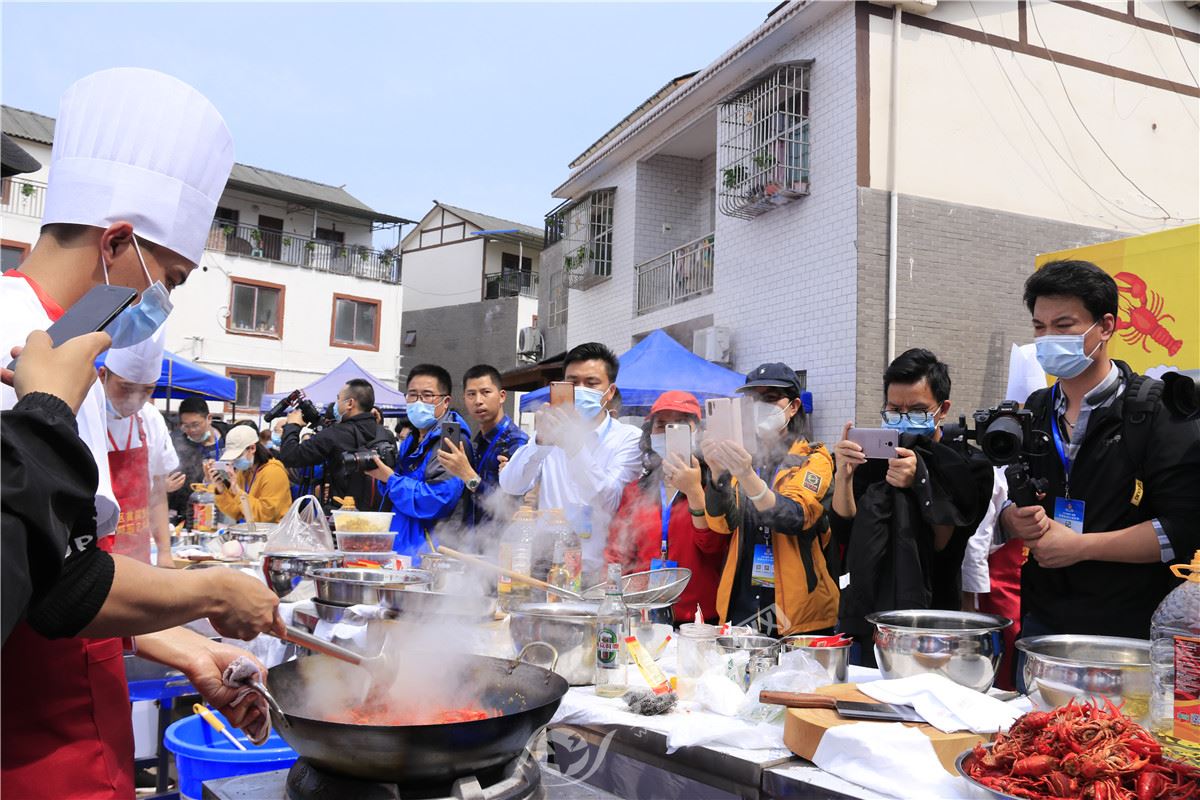 開幕式結束后,小龍蝦廚藝大賽、稻蝦共生種養基地參觀和垂釣體驗等系列活動有序開展。在塘壩鎮稻蝦廣場,十幾名來自潼南區各大酒店的大廚正在熱火朝天地烹飪著一鍋鍋香氣撲鼻的小龍蝦,這正是“小龍蝦廚藝大賽”的比賽現場。各位廚師將自己的拿手好菜烹飪好后,交由評審團分別打分,最終決出一名冠軍。一盤盤色香味俱全的小龍蝦引得現場觀眾食指大動。在品嘗到這些大廚的手藝后,觀眾和媒體記者個個交口稱贊。眾多記者點評說:“名不虛傳,潼南小龍蝦體型大,色澤鮮亮,肉質肥嫩,肉含量多,很好吃,而且看起來易于清洗,不愧是生態養殖,好水養出好龍蝦。”