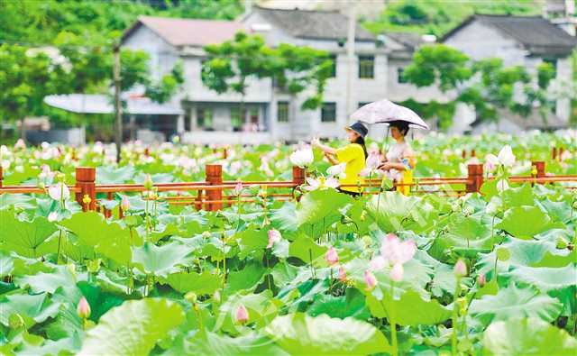 7月6日,游客在秀山縣隘口鎮(zhèn)平所村太空蓮基地自拍賞花。該基地總面積200畝,主要種植具有較高經(jīng)濟(jì)效益和觀光價(jià)值的太空蓮,產(chǎn)業(yè)覆蓋農(nóng)戶124戶,其中貧困戶16戶64人。基地采取農(nóng)戶自栽自管、平所村專業(yè)合作社負(fù)責(zé)加工和銷售、鎮(zhèn)政府提供種苗和肥料補(bǔ)助的方式運(yùn)作,通過(guò)出售蓮子、蓮心茶及荷葉等,實(shí)現(xiàn)了村民和村集體經(jīng)濟(jì)雙增收。