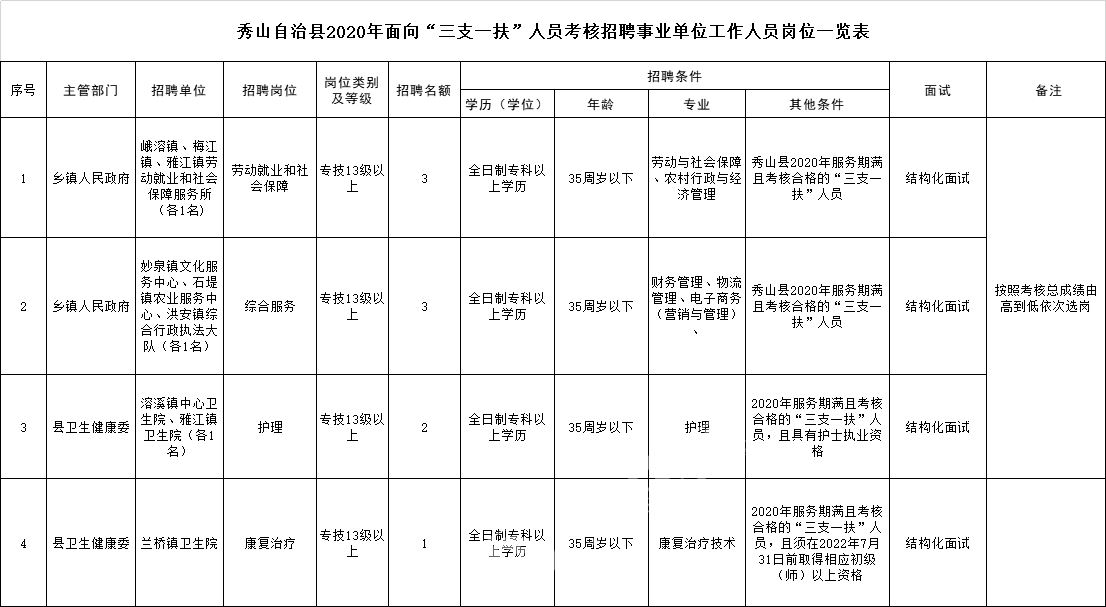 秀山網(wǎng)訊 近日,記者從縣人民政府網(wǎng)獲悉,為加強(qiáng)事業(yè)單位工作人員隊(duì)伍建設(shè),秀山將面向2020年服務(wù)期滿且考核合格的“三支一扶”人員考核招聘9名事業(yè)單位工作人員。