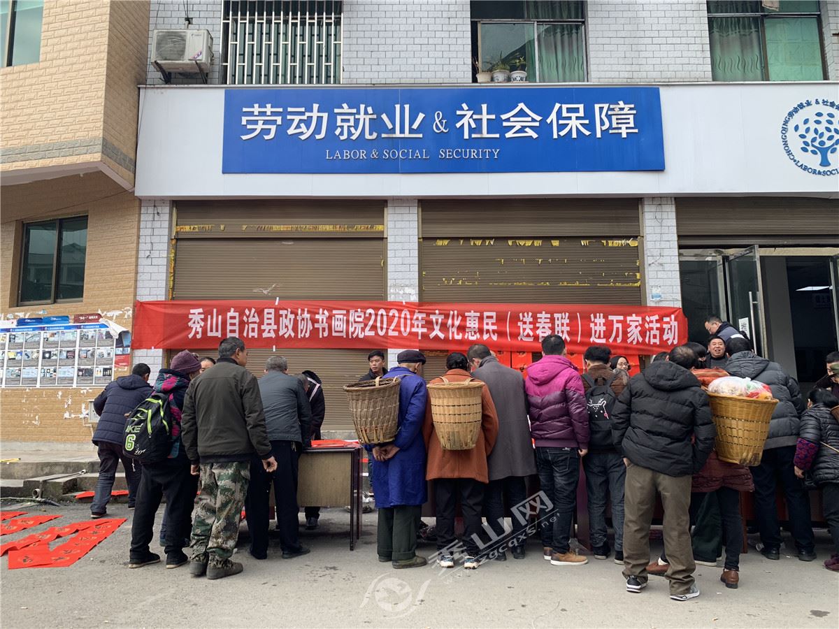 秀山網訊 1月20日,縣政協書畫院2020年文化惠民進萬家活動走進里仁鎮,為該鎮群眾送去書畫院書法家書寫的春聯。縣政協副主席陳慧參加。