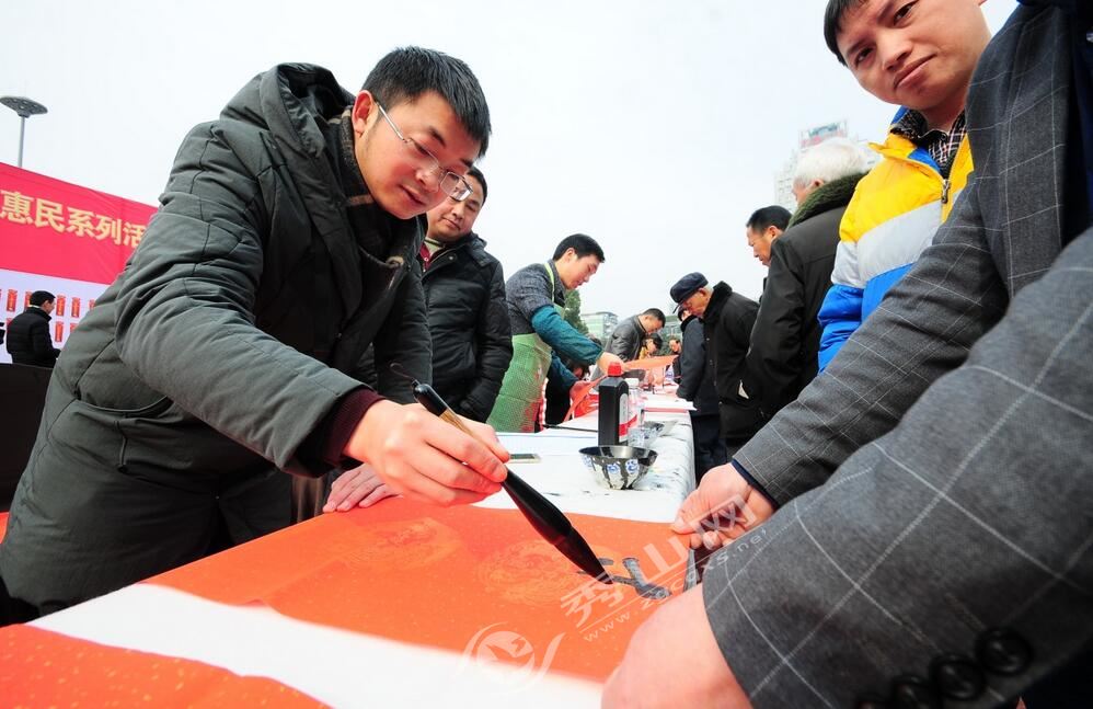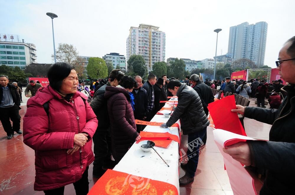 當天,秀山數10位書法家現場揮毫潑墨免費寫送春聯,市民積極參與其中。據統計,當天共免費贈送春聯3000余副。
