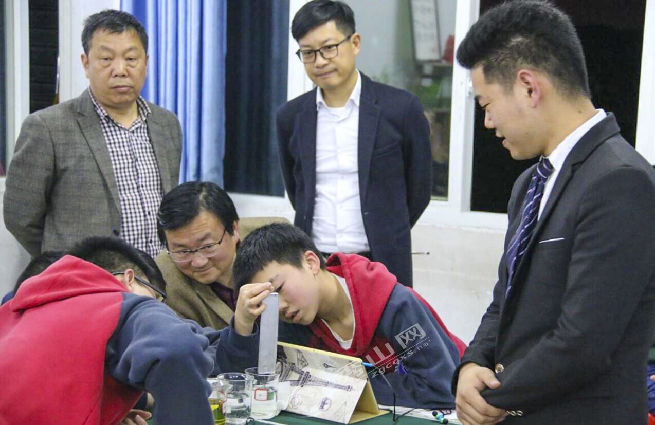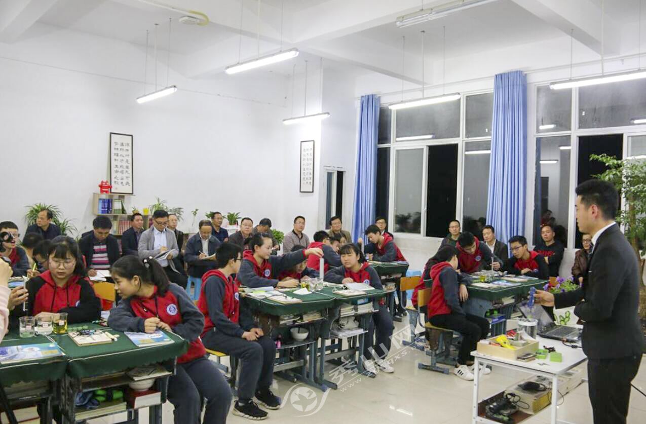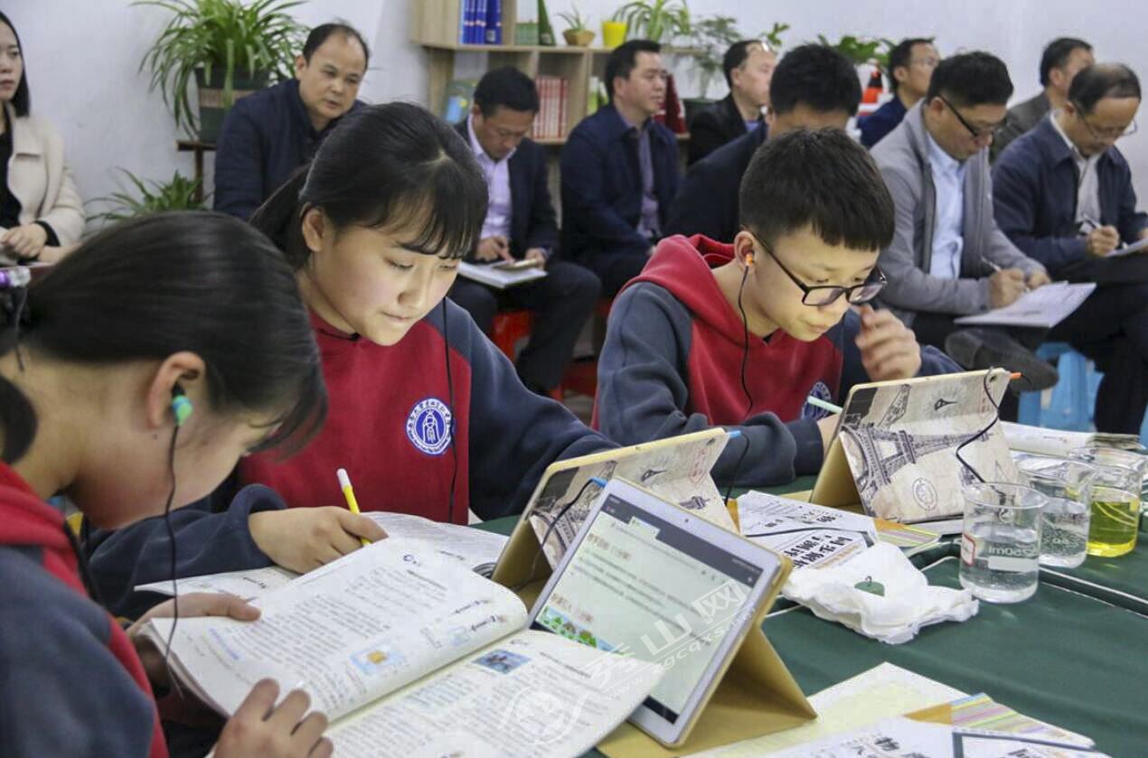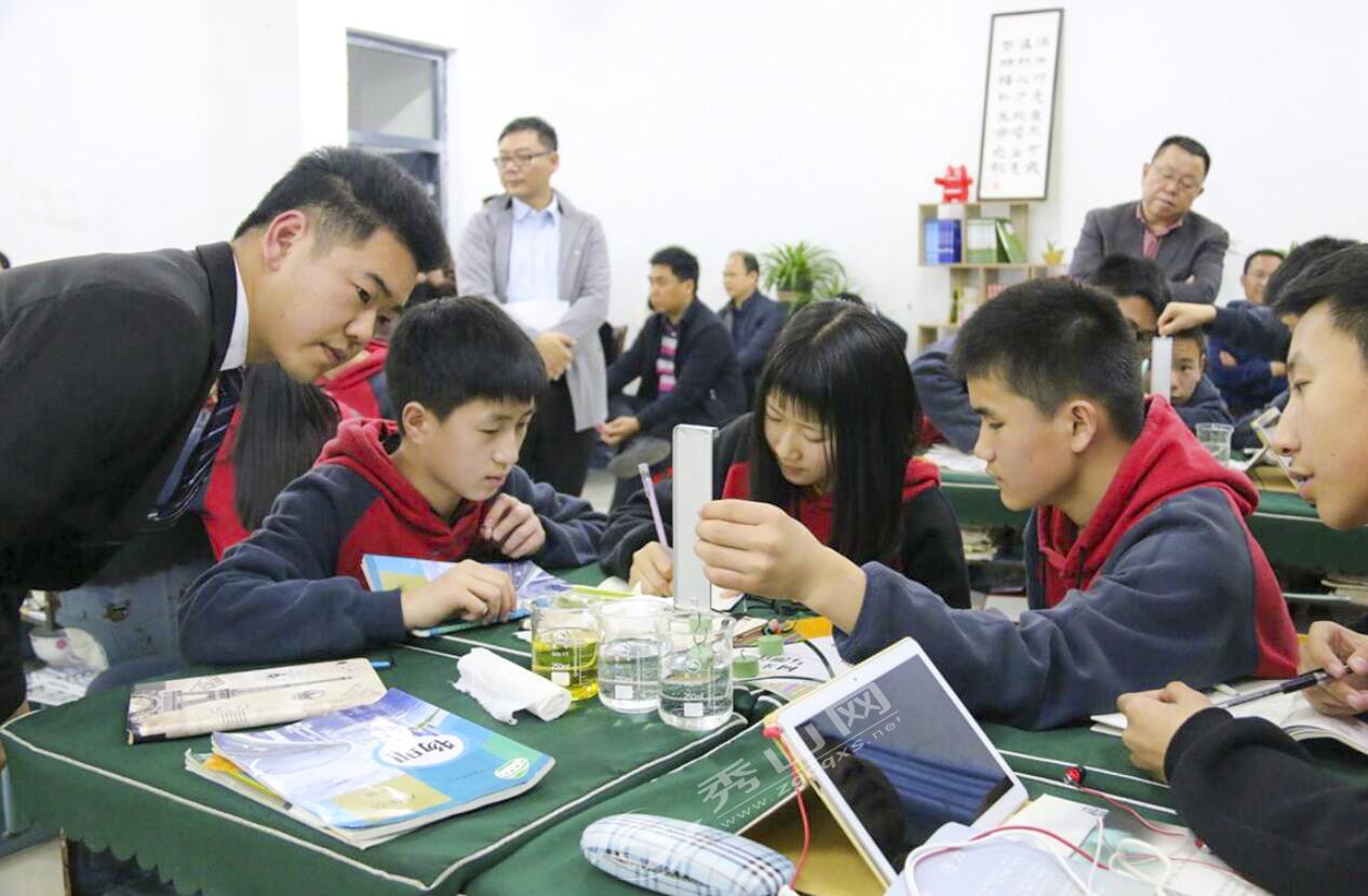 會前,縣教委相關領導及專家團隊到該校八年級七班,認真觀聽了該校物理老師譚振富主講的一堂混合式教學物理課。