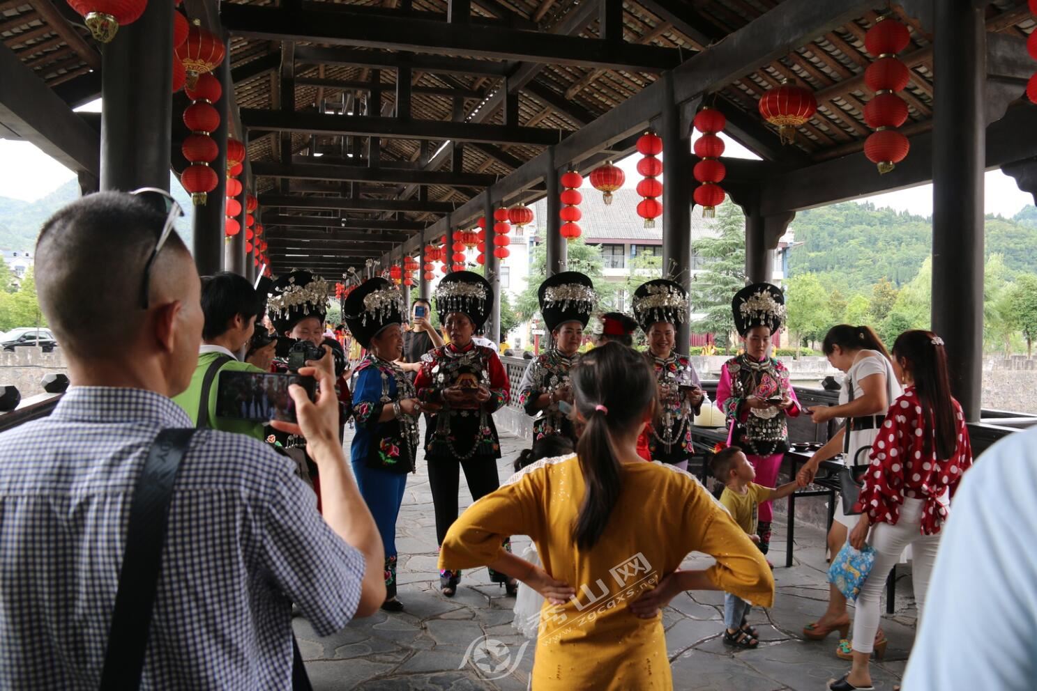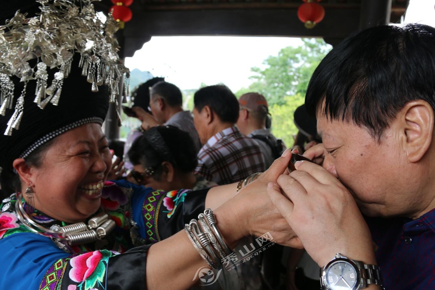 前方風雨廊橋上,,一道“路障”攔住了專家組行進的道路。相傳,苗族好客,但客人進寨時,要接受特殊的迎賓儀式飲下攔門酒,喝了主人家自釀的甜米酒才能進寨。“三碗不過崗,要飲三碗才能過去哦!”