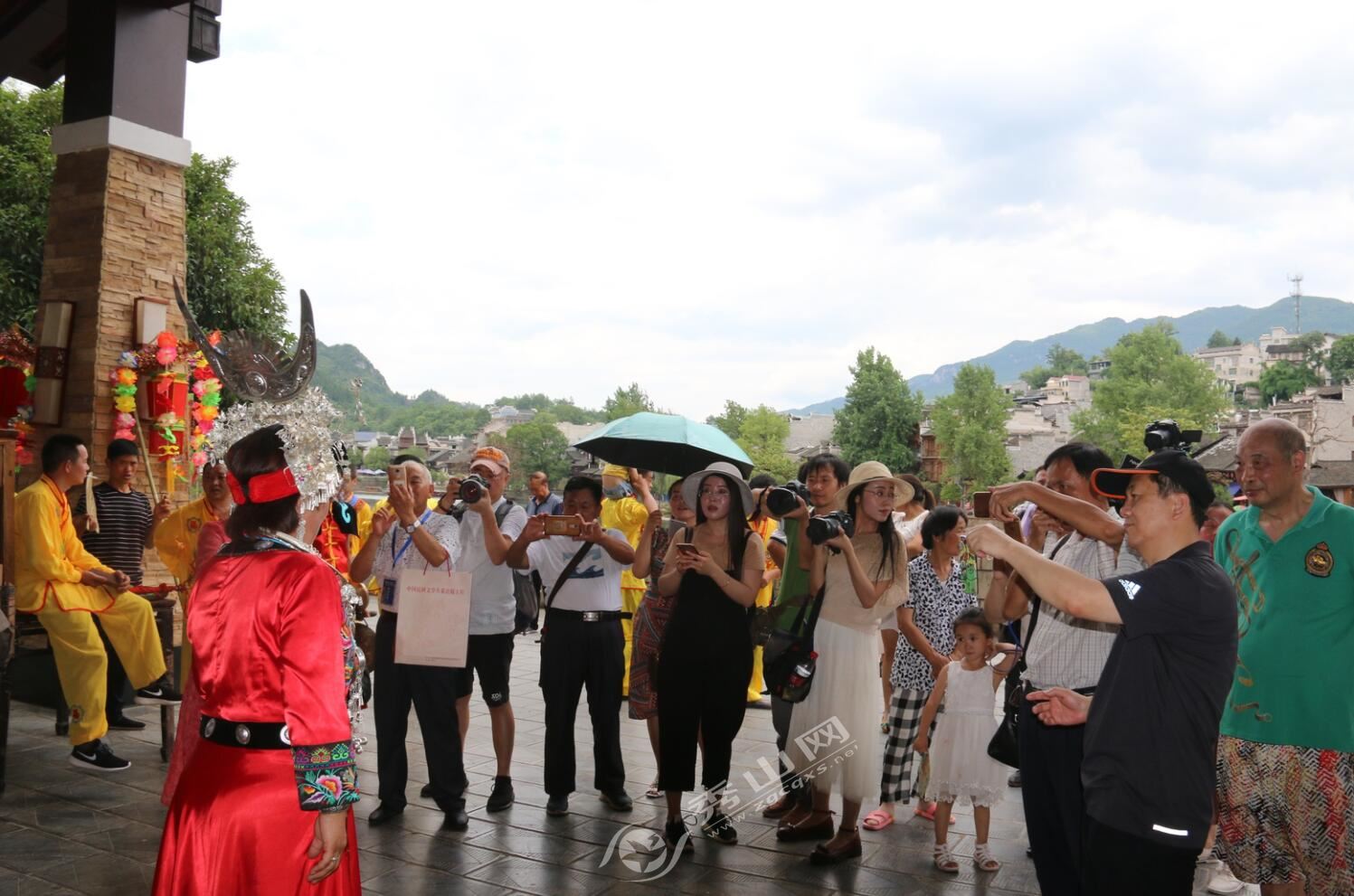 “咚~咚~”“嗚~嗚~”下午3點,專家組一行剛抵達洪安老街廣場萬年臺,迎賓鼓、長號、大鑼、牛角便響起,專家們深深地感受到一股來自少數民族的好客熱情,不由自主拿出隨身攜帶的相機、手機錄像留戀。