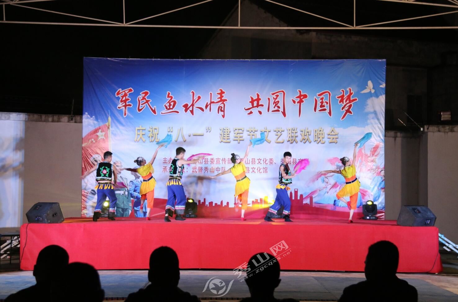 7點30分,晚會正式開始,為把最精彩的文化大餐奉獻給部隊官兵,演員們精心排練了11個節目,內容涵蓋舞蹈、歌曲、小品、快板等多種表演形式。演出在舞蹈《花開中國》中拉開帷幕,部隊官兵獻唱的一首《精忠報國》唱出了在場軍民在習近平新時代中國特色社會主義思想指引下,闊步前行的熱血豪情;演職人員講的故事《紅軍在秀山》、唱的歌曲《為祖國干杯》《又唱新山歌》、表演的小品《調解》、歌曲舞蹈《鬧花燈》、《不忘初心》等節目精彩絕倫,贏得臺下官兵們的陣陣掌聲。期間,演員們走下舞臺與官兵們互動合唱歌曲《為了誰》,將現場氣氛掀起高潮。