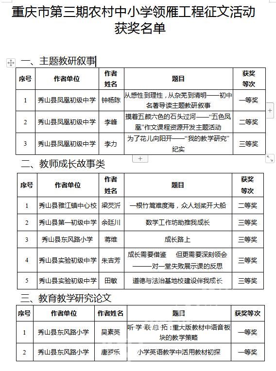 秀山網訊 日前,市教委通報重慶市第三期農村中小學領雁工程征文活動評審結果,公布了獲獎教師姓名、所在單位、征文題目及獲獎等次,我縣27件教師作品榜上有名。