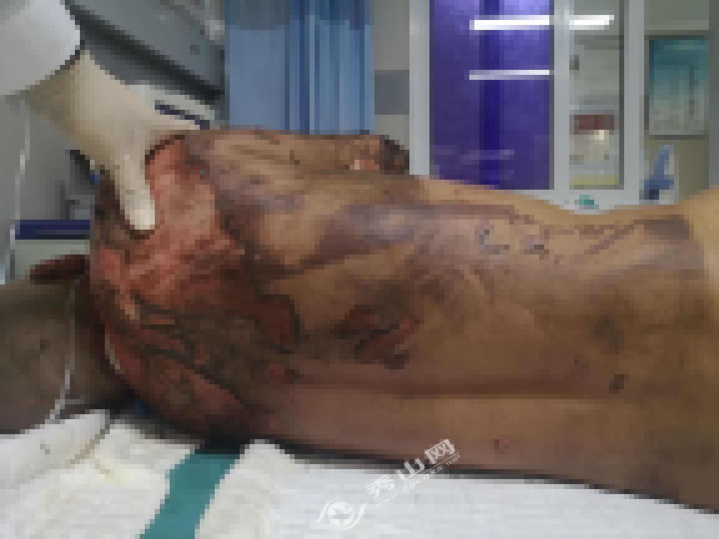 當(dāng)天,在大家的幫助下,家人將楊龍送到縣人民醫(yī)院,但由于傷情嚴(yán)重,在經(jīng)縣人民醫(yī)院同意后當(dāng)天轉(zhuǎn)入陸軍軍醫(yī)大學(xué)第一附屬醫(yī)院(西南醫(yī)院)繼續(xù)治療。經(jīng)診斷顯示,28歲的楊龍頭部、面部、頸部、軀干等全身多處燒傷,燒傷面積達(dá)32%(深Ⅱ°25%,Ⅲ°7%),重度吸入性損傷,低血容休克,雙眼燒傷。