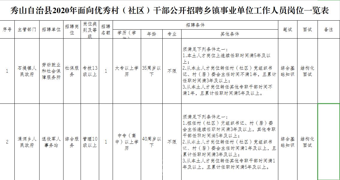 秀山網訊 為加強事業單位工作人員隊伍建設,近日,我縣發布面向優秀村(社區)干部公開招聘鄉鎮事業單位工作人員簡章,面向全縣優秀村(社區)干部、本土人才公開招聘鄉鎮事業單位工作人員2名。